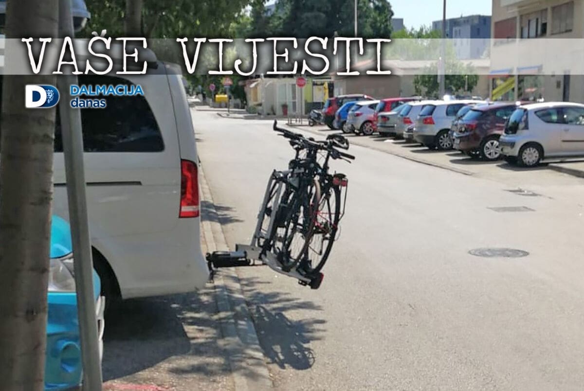 Više nego zanimljiv prozor snimio je naš čitatelj danas poslijepodne na cesti s istočne strane Jokera u Splitu. Kombi stranih tablica bio je parkiran na parkingu uz cestu, a straga je imao držač za bicikle koji su stršali više od metra unutar kolničkog traka.