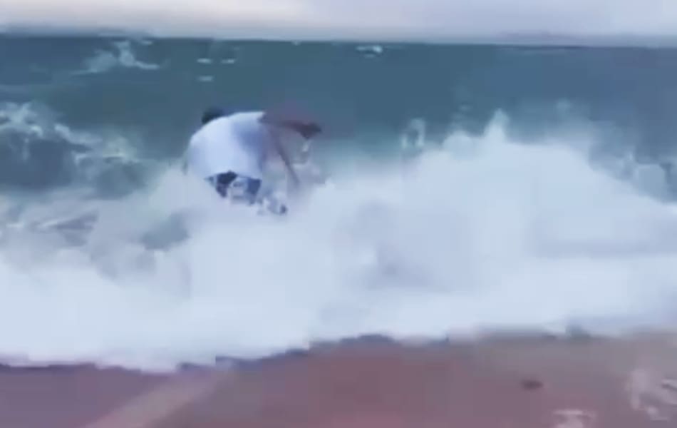 Ima i onih koji se vesele vremenskih neprilikama. Tako je jedan muškarac, uslijed najjačeg juga i najizraženije plime, veselo skakao obalom, a nije imao problema s tim da ga valovi smoče.