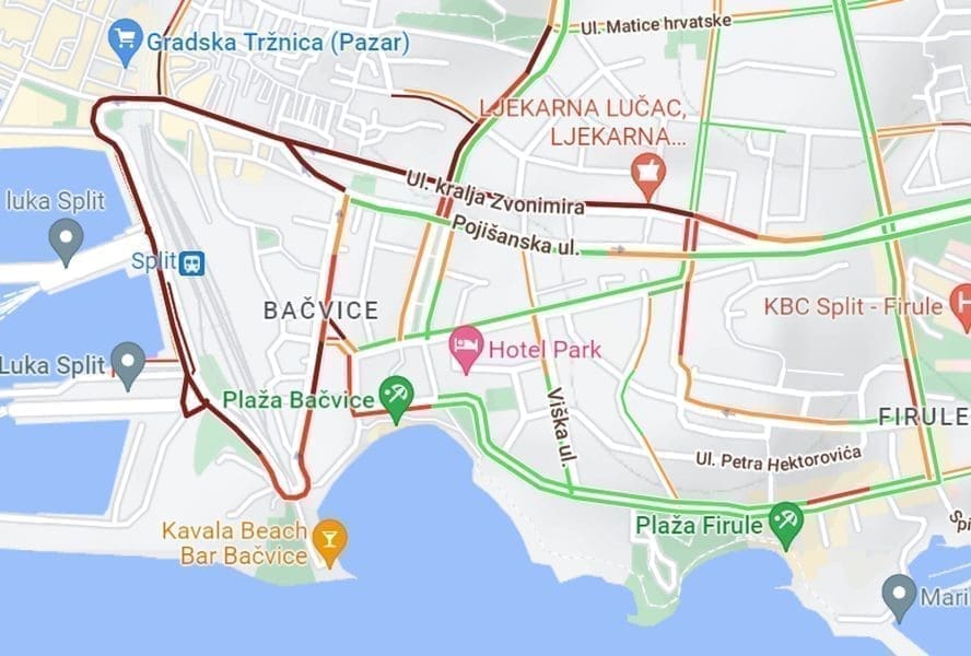 Najveća gužva (očekivano) je u samom centru gradu, i u smjeru Trajektne luke u Splitu.
