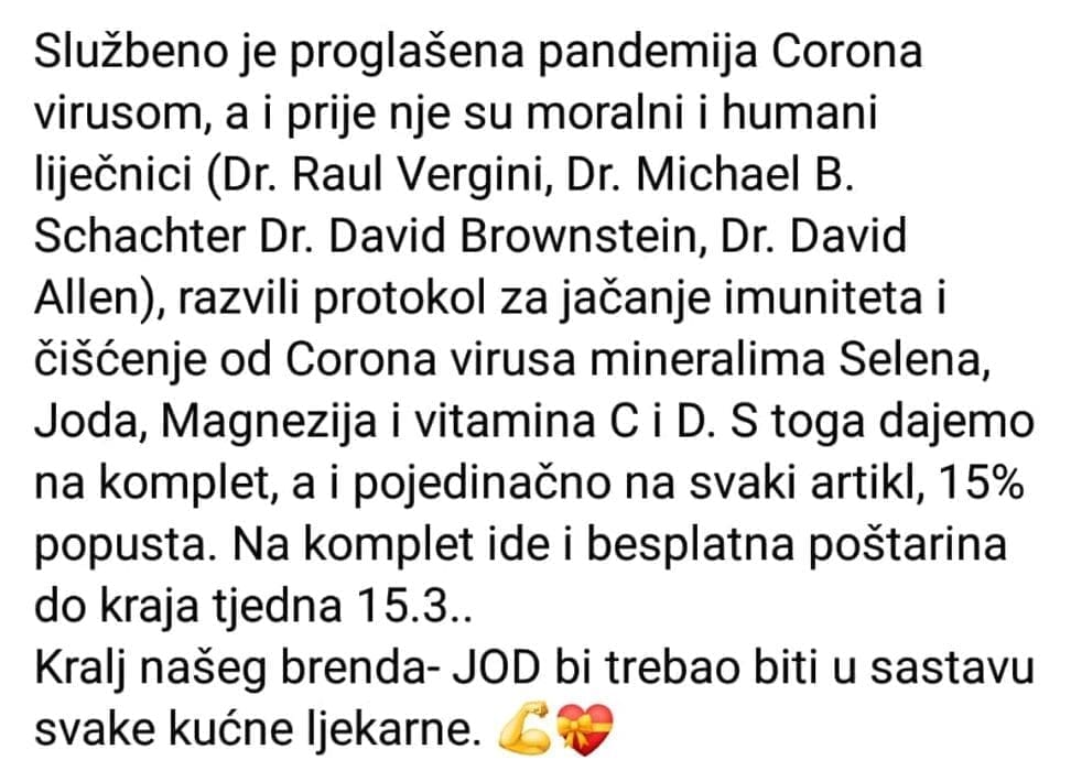 - Službeno je proglašena pandemija Corona virusom, a i prije nje su moralni i humani liječnici (Dr. Raul Vergini, Dr. Michael B. Schachter Dr. David Brownstein, Dr. David Allen), razvili protokol za jačanje imuniteta i čišćenje od Corona virusa mineralima Selena, Joda, Magnezija i vitamina C i D- stoji u njenoj objavi.