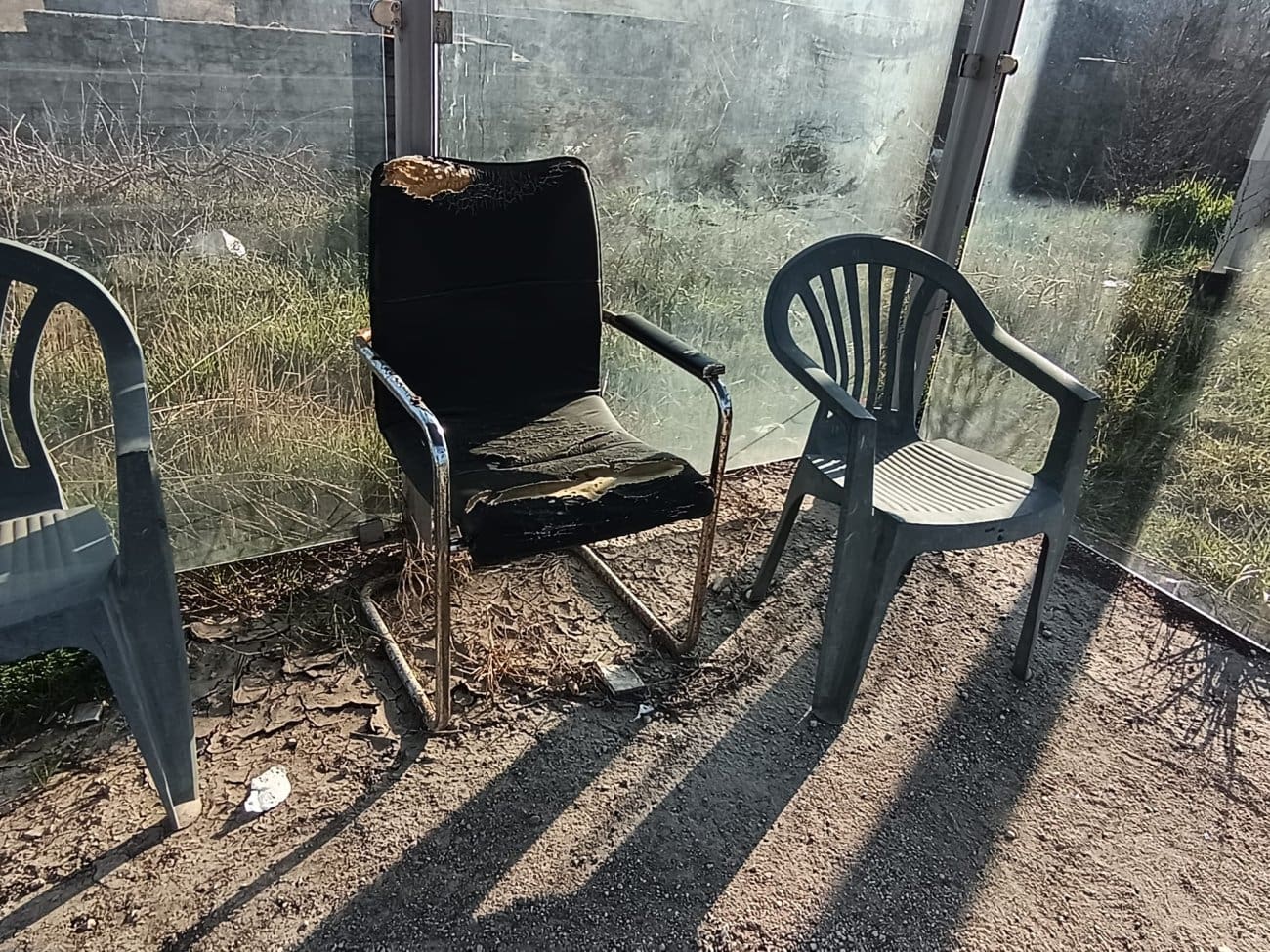 Na snimkama je vidljivo da se unutar staklene nadstrešnice nalaze dotrajale i poderane stolice, zahrđale konstrukcije te zapušten okoliš. Jedna stolica gotovo je potpuno uništena – presvlaka je poderana, spužva izviruje, a metalni dijelovi nagrizeni su hrđom. Druga je plastična stolica postavljena pokraj nje, dok je pod ispod njih ispucao i prekriven zemljom i suhim raslinjem.