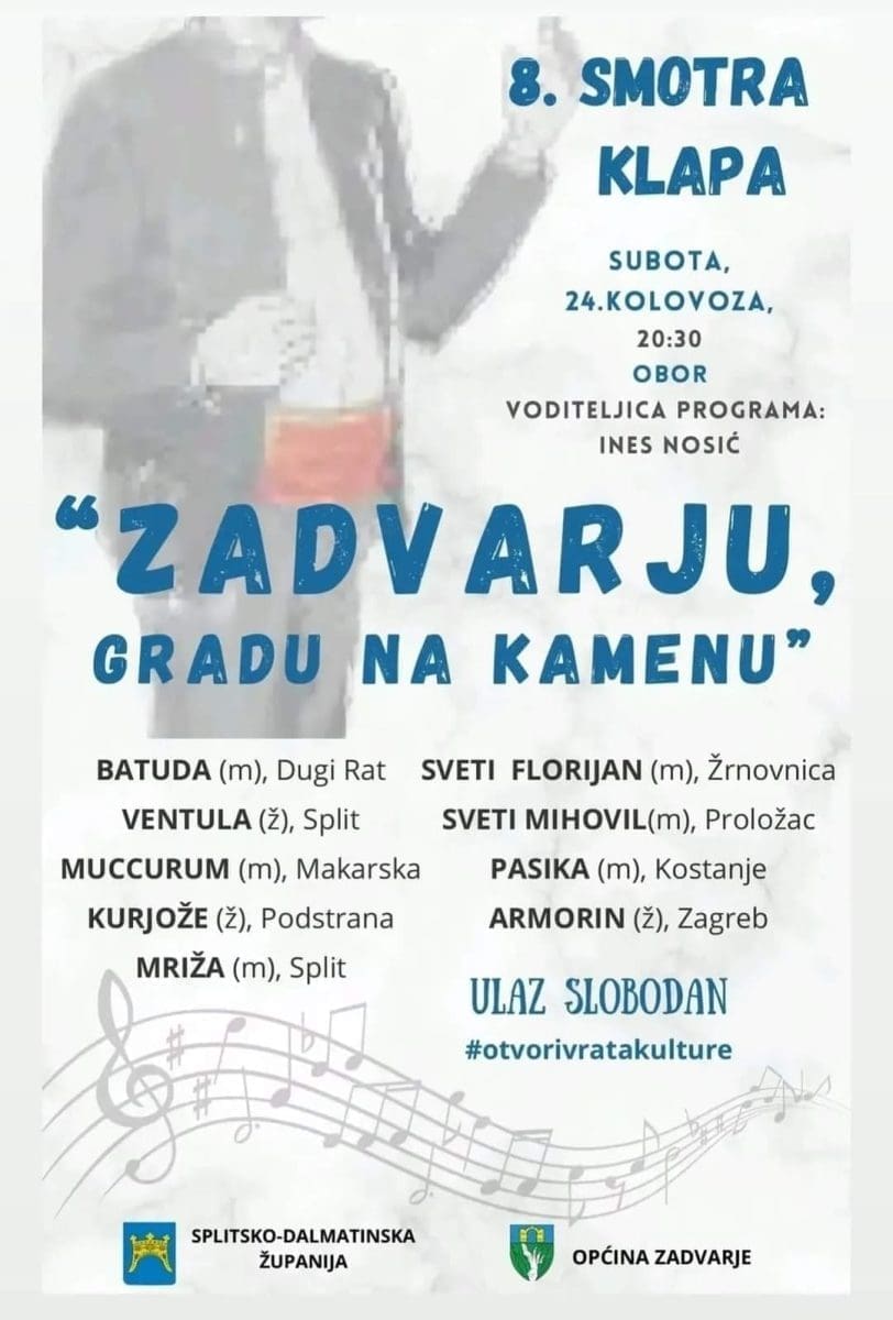 I ove godine, kao i u proteklim izdanjima, organizatori su se potrudili okupiti impresivnu klapsku družinu čija je kvaliteta prepoznata na brojnim manifestacijama diljem zemlje. Osma smotra klapa pod nazivom „Zadvarju, gradu na kamenu“ održat će se u subotu 24. kolovoza s početkom u 20:30 sati na Oboru. Posjetitelji će imati priliku uživati u nastupima renomiranih klapa koje su svojim izvedbama osvojile srca publike i struke.