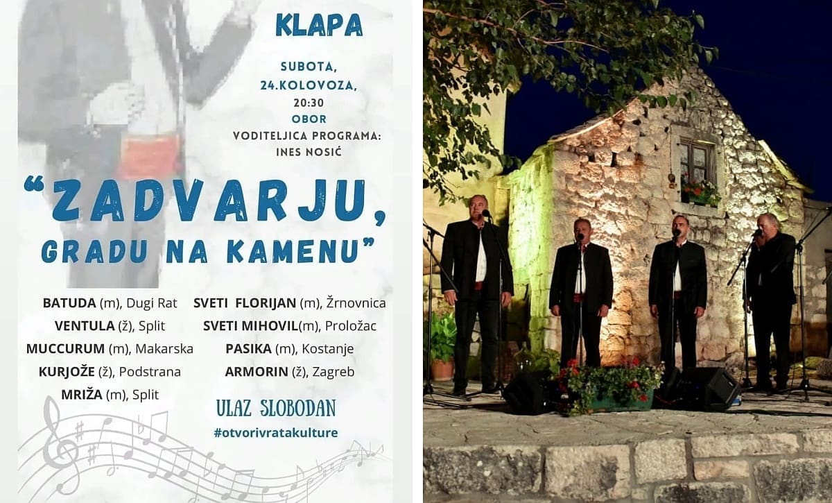 Sigurno je već poznato da Zabiokovlje skriva svojevrsnu oazu usred sivog kamenjara, pitoreskno Zadvarje, koje ne samo da nudi svoju prirodnu ljepotu, povijest i ljubazno gostoprimstvo, već i ove subote, pruža priliku uživanja u jedinstvenom višeglasju, klapskoj pjesmi. Zadvarski Obor, mjesni trg, već osmu godinu zaredom, postaje mjesto susreta ljubitelja klapske glazbe iz cijele Hrvatske.
