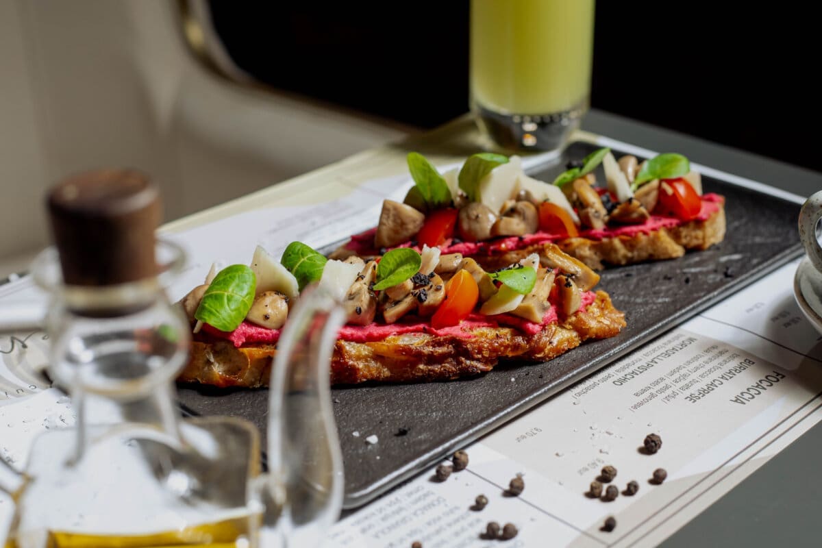 Jednostavna, ali uvijek savršena – naša bruschetta dolazi s najkvalitetnijim sastojcima, u kombinaciji s humusom od cikle, šampinjonima, grana padano sirom, cherry rajčicama i matovilcem, idealna za lagani početak obroka ili kao užina uz čašu vina.