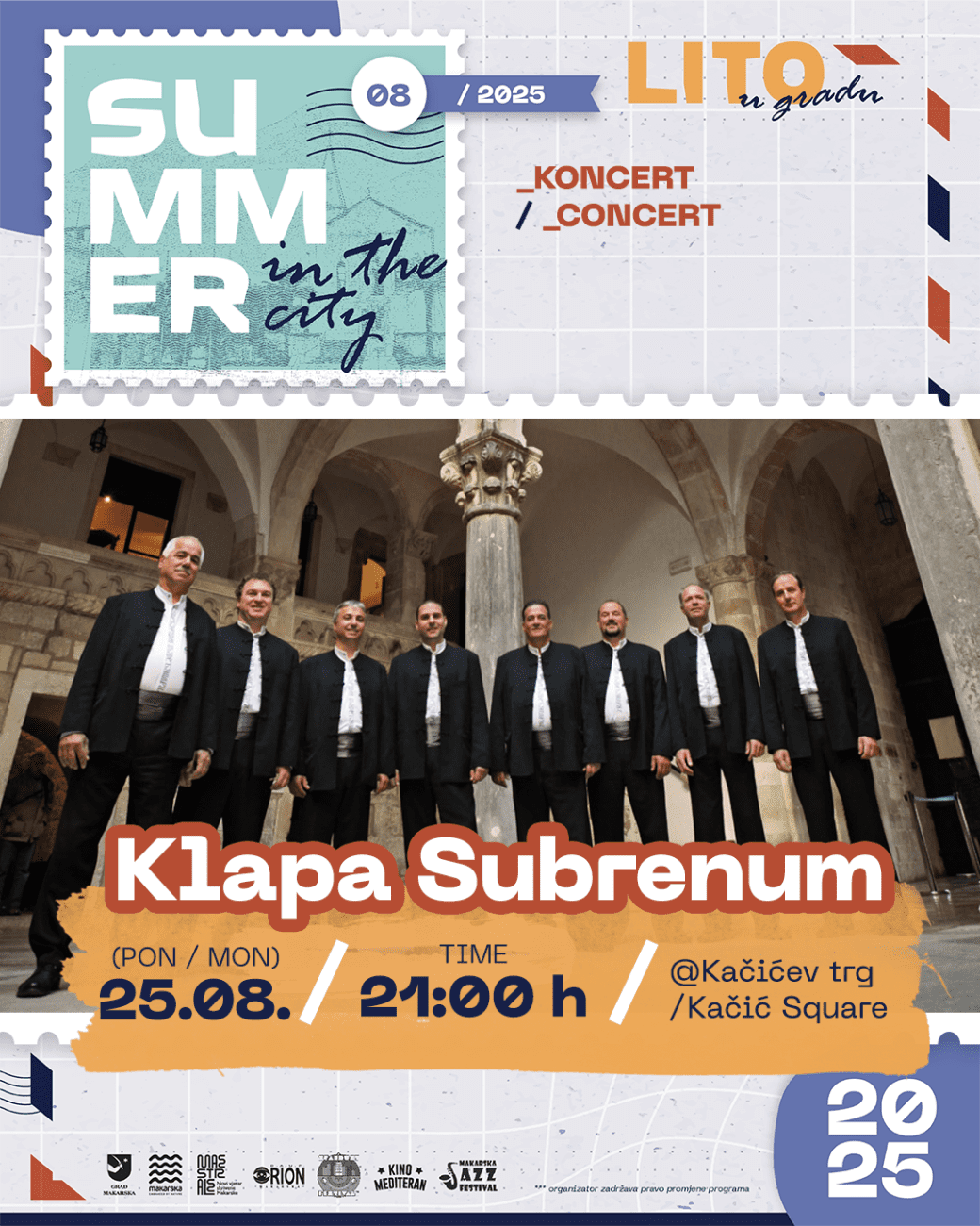 - Pozivamo vas na koncert nagrađivane Klape Subrenum koji će se održati večeras, 25. kolovoza, s početkom u 21:00 sat na Kačićevom trgu.