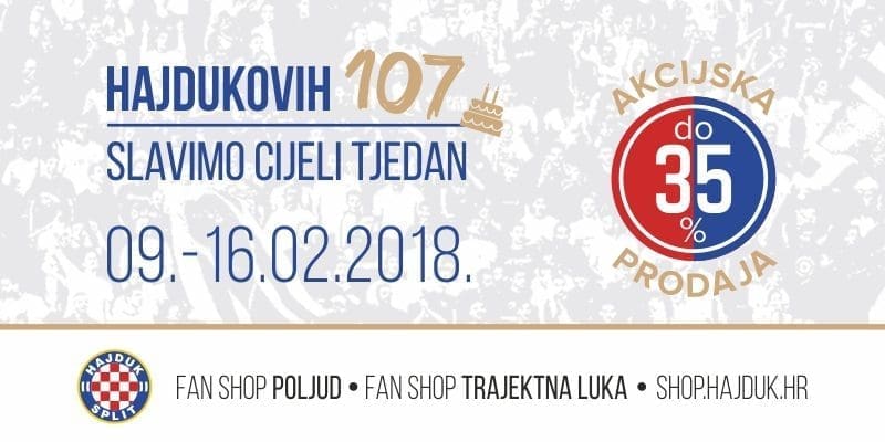 U povodu nadolazećeg Hajdukovog 107. rođendana, pripremljena je slavljenička akcijskua prodaja u fan shopovima na Poljudu i u trajektnoj luci te na službenom web shopu.