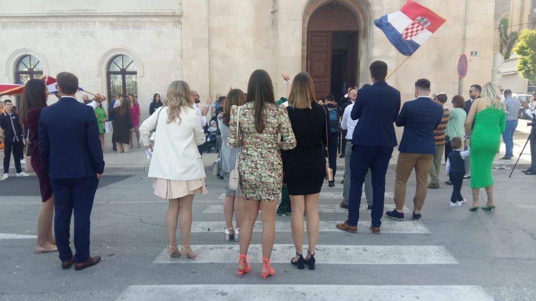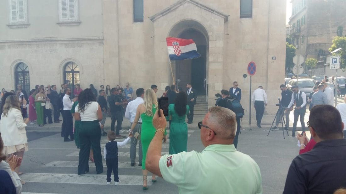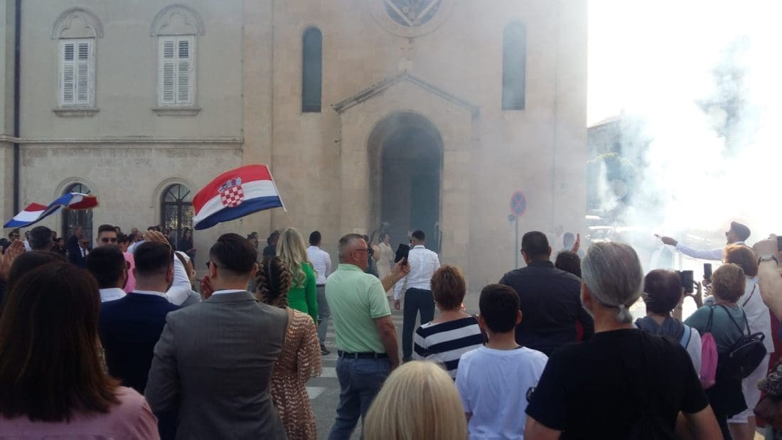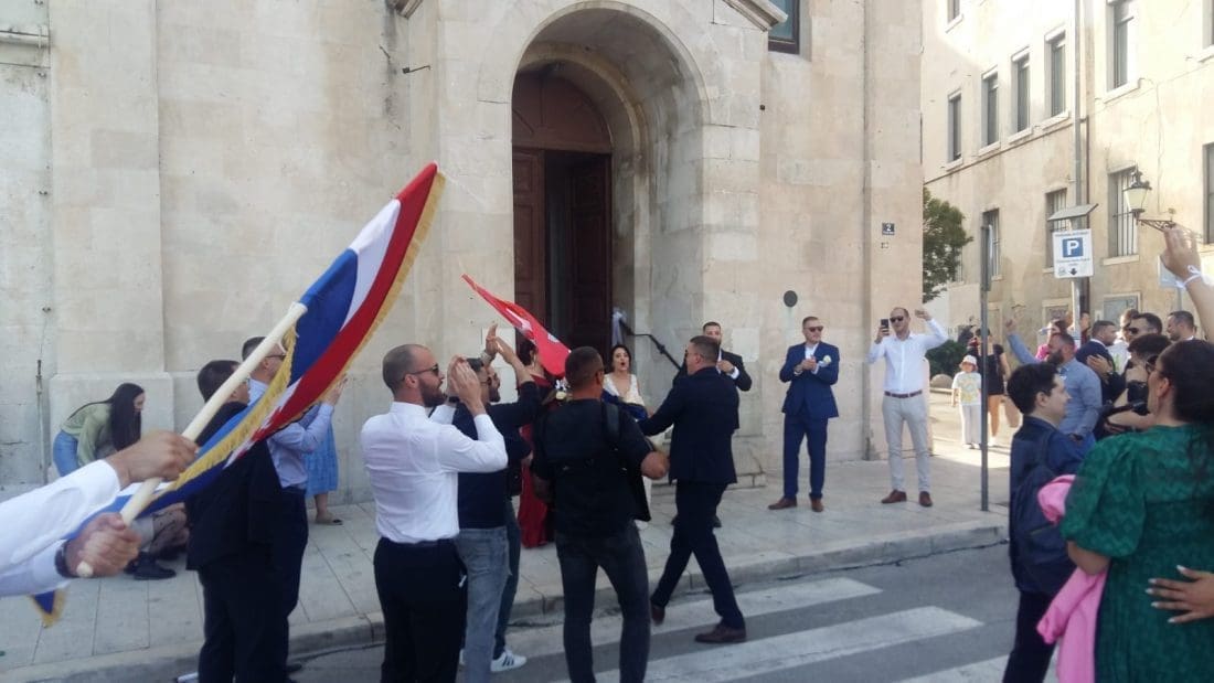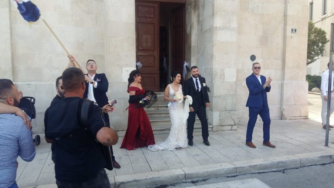 U cijelom gradu danas vlada gužva, na svakom štekatu traži se stolica više, a u toj gužvi pred crkvom sv. Frane nismo mogli ne zamijetiti upravo vjenčani par i njihove goste. Pri izlasku iz crkve dočekala ih je pjesma, zastave i bengalke.