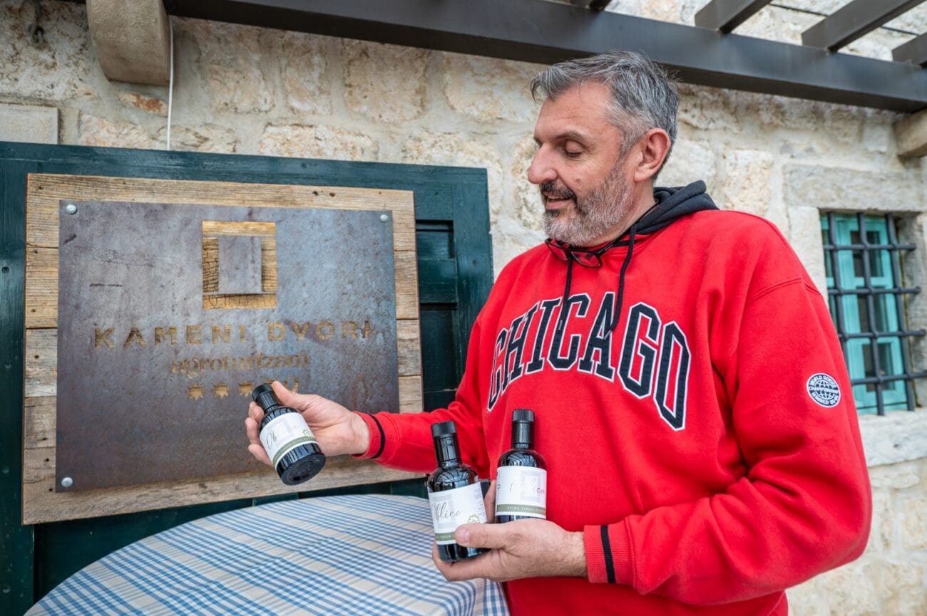 „Maslinovo ulje proizvodimo metodom ‘što Bog da’: stabla ne tretiramo kemikalijama, samo očistimo i pokosimo travu. Nismo to počeli zato što smo veliki ekolozi – iako cijenim taj pristup – nego zato što jednostavno ne stignemo.“