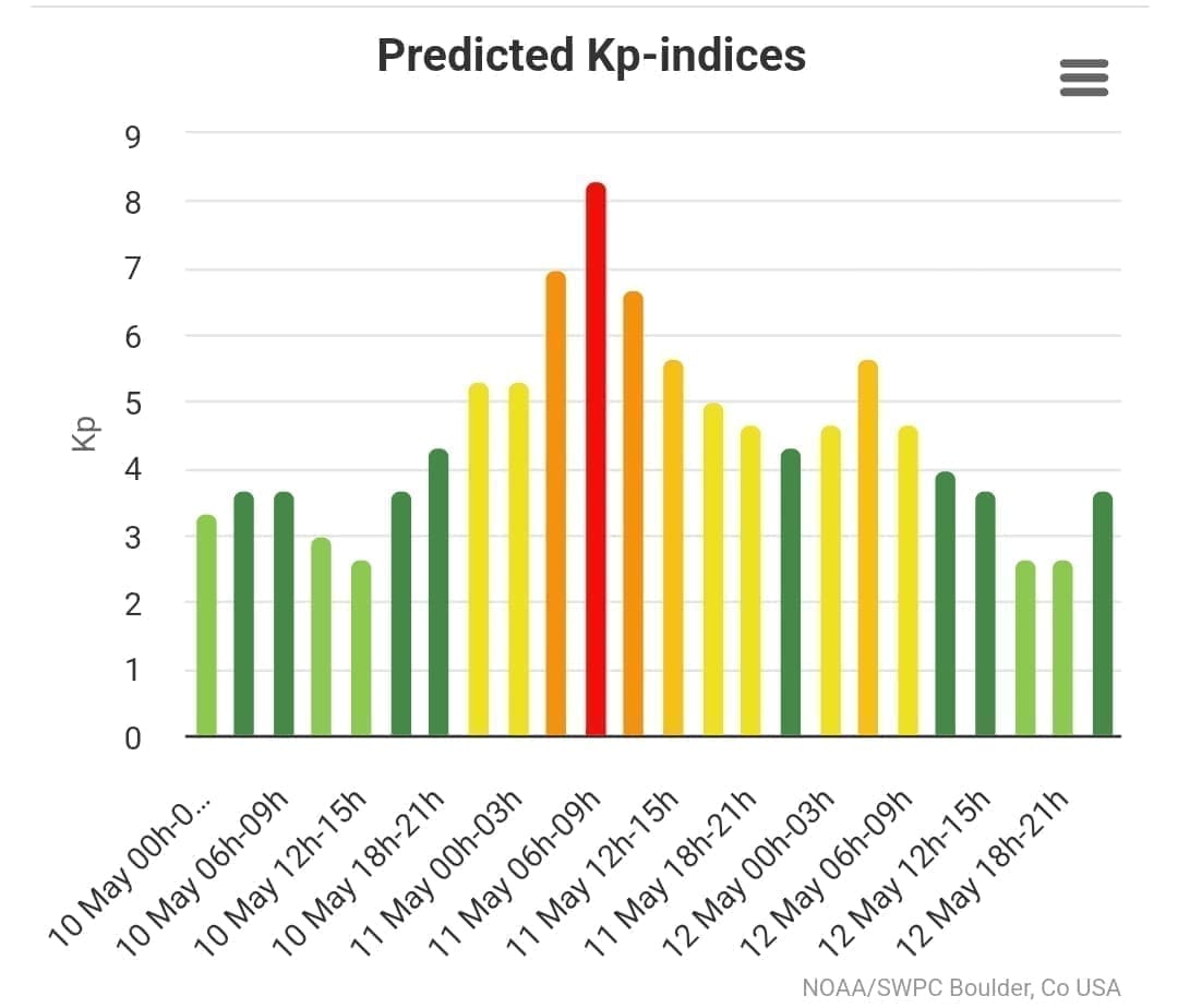 "Prvi od šest izboja koji je prema Zemlji izbacila golema sunčeva pjega AR3664 upravo je udario u magnetsko polje našeg planeta. Udar koji je zabilježen 10. svibnja u 16:45 UTC potresao je magnetometre diljem svijeta (npr., 108 nT u Boulderu, Colorado) i pokrenuo ozbiljnu (G4-klase) geomagnetsku oluju. Oluja je trenutno u tijeku. Očekuje se dolazak daljnjih izboja sa Sunca, a njihov dolazak mogao bi produžiti oluju sve do vikenda", glasila je prva obavijest dana nakon koje je stigla i nova.
