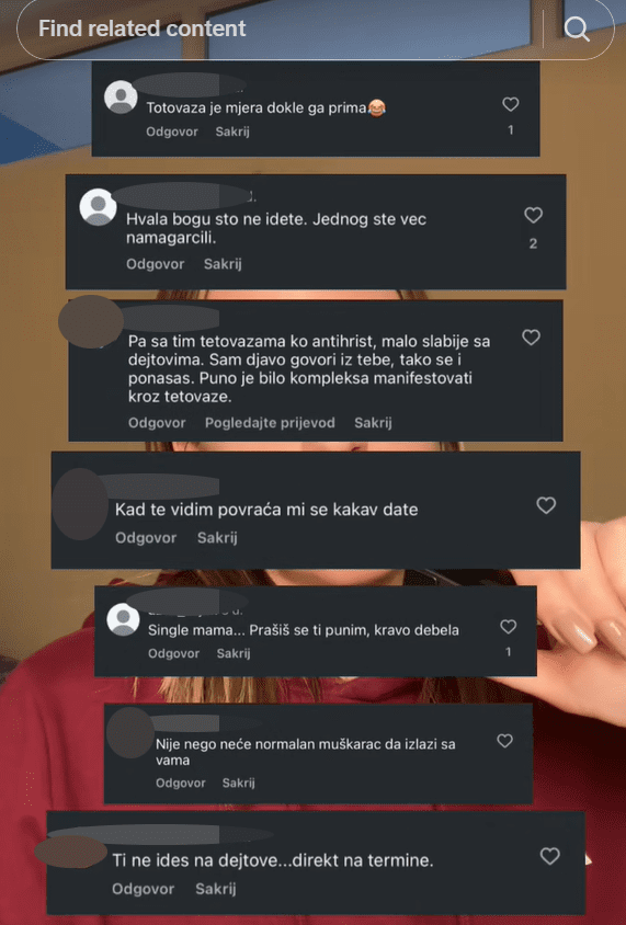 'Fali ti pridjev nesposobne', 'Tebe nitko neće više. Muškarci traže ženu koja nema djece, zašto bi ja odgajao tuđe dijete nisam lud', 'Da ti je kalendar bio tak popunjen dok si bila u braku, ne bi danas bila solo', 'Na šta ličiš. Fuj. Sa tim tetovažama. A single mama što nemaš ništa u glavi', pisali su joj korisnici TikToka - muškarci.