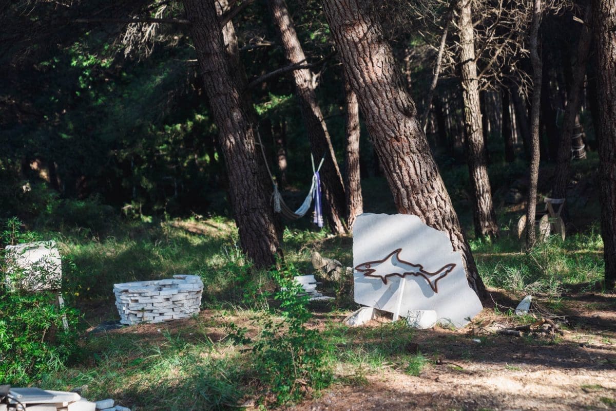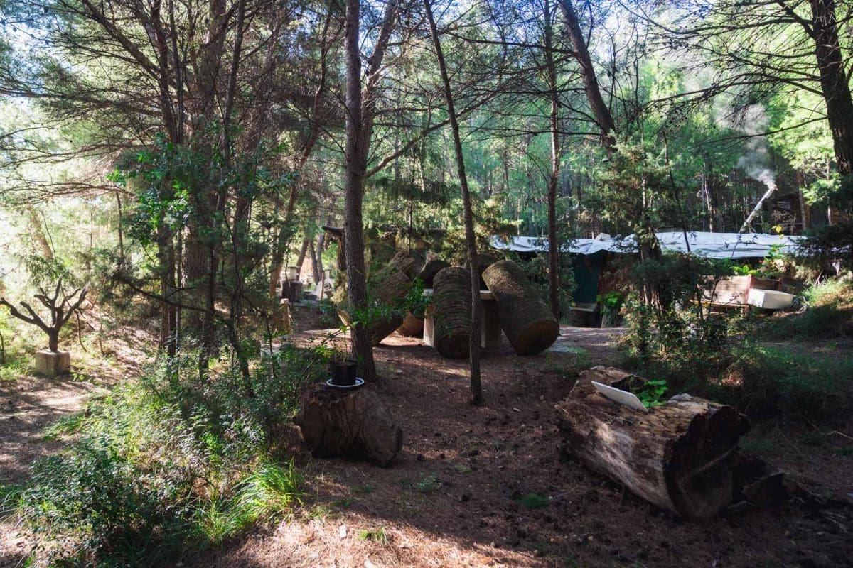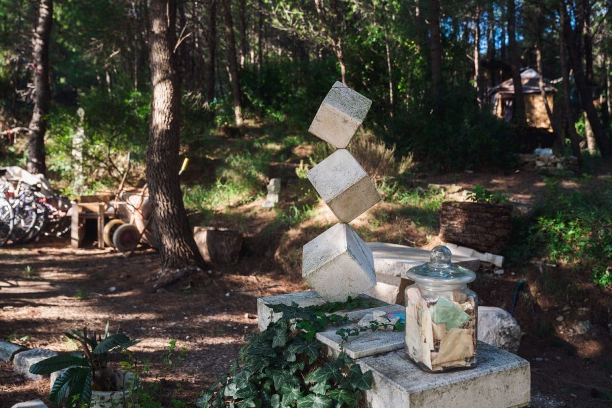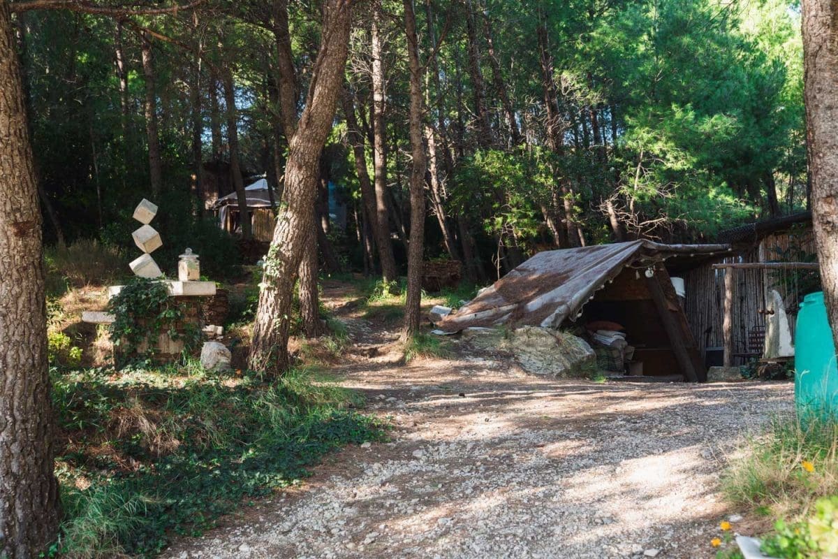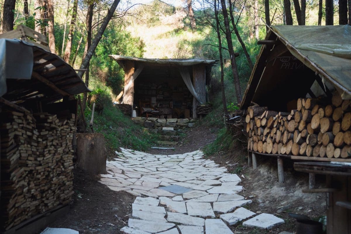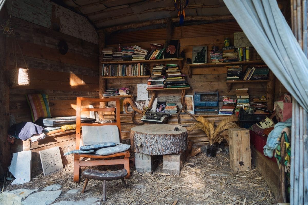 Ulazak u park je svojevrsni muzej kamenih skulptura. Poviše njega, nalaze se ručno izrađene nastambe od drveta. Izgledaju kao bajkovite kolibice smještene usred guste šume, sa ognjištem, krevetima i kuhinjom. Tuš je zasebna prostorija koju je izgradio jedan gost iz Amazone od stabljika bambusa. Nalik na tropsku kišu, ova mala prostorija zaista ostavlja dojam amazonske prašume. U srcu šume nalazi se knjižnica. Otvoreni, natkriveni prostor izgrađen od drva dom je međunarodnih knjiga.