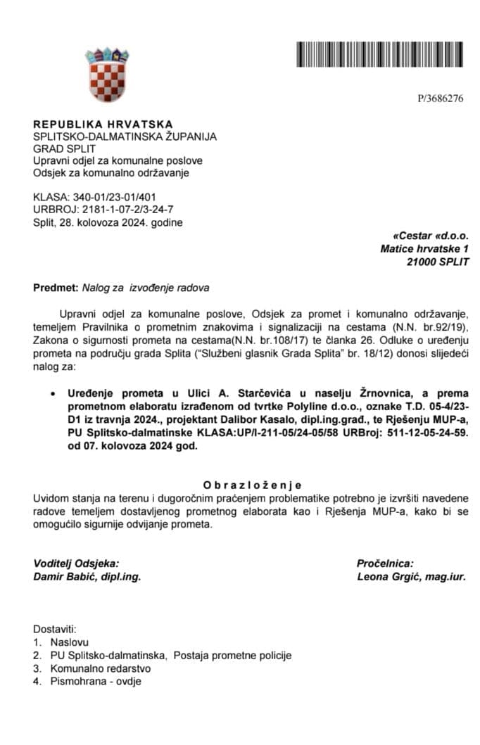 "Taj projekt je prodan u 2023. godini, i trebao je biti prepravljen u Starčevićevoj ulici kada se zgotovi građevinska dozvola okretišta koje je pri kraju. Projekt je uredno protokolirao naš predsjednik odmah po završetku. Digitalnim putem sam ga osobno proslijedila i šefu odsjeka i drugoj osobi u Banovini. Poslala sam sigurno jedno 50 e-mailova za taj projekt i kada će biti gotov, u koji su bili uključeni i Cestar, i vlasnici Cestara, Odsjek za komunalne poslove i svi", kaže.