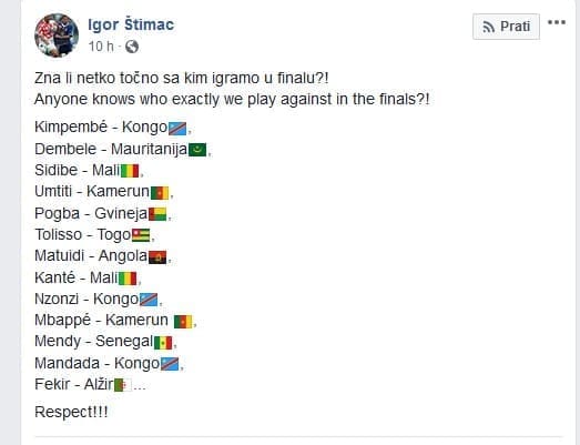 Komentirajući nadolazeće povijesno finale između Hrvatske i Francuske, bivši hrvatski izbornik na svome je Facebooku komentirao sastav francuske nogometne reprezentacije i to tako da se upitao "Zna li netko točno s kim igramo u finalu?", aludirajući na podrijetlo francuskih reprezentativca koji su mahom iz afričkih zemalja...