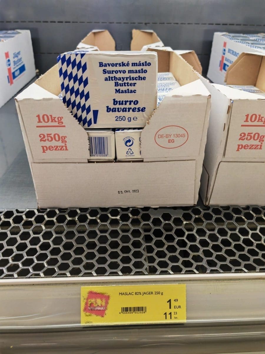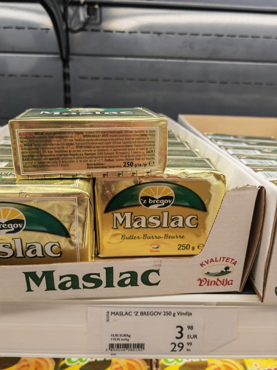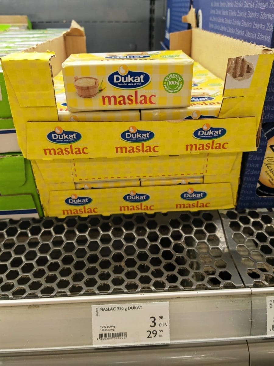Tako je primjerice maslac i prije poskupljenja bio dosta skup. Tako se danas u jednom trgovačkom centru za hrvatski maslac treba izdvojiti gotovo četiri eura (ili 30 kuna), dok onaj njemački košta 2.52 eura ili čak 1.49 (11.23 kuna). U ovom posljednjem slučaju riječ je o akcijskoj cijeni.
