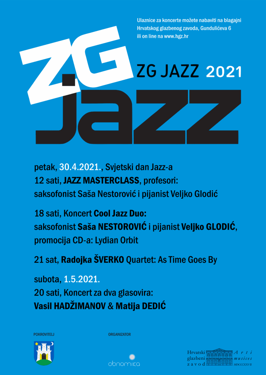 Međunarodni ZG JAZZ festival ove se godine održava treći put za redom. Sutra, 30. travnja, na Svjetski dan jazz-a i 1. svibnja u Hrvatskom glazbenom zavodu, pred publikom uživo nastupit će vrsni jazz umjetnici: u 18 sati, Koncert The Cool Jazz Duo, Saša Nestorović, saksofon i Veljko Glodić, glasovir, a u 21 sat Koncert Radojka Šverko Quartet!
