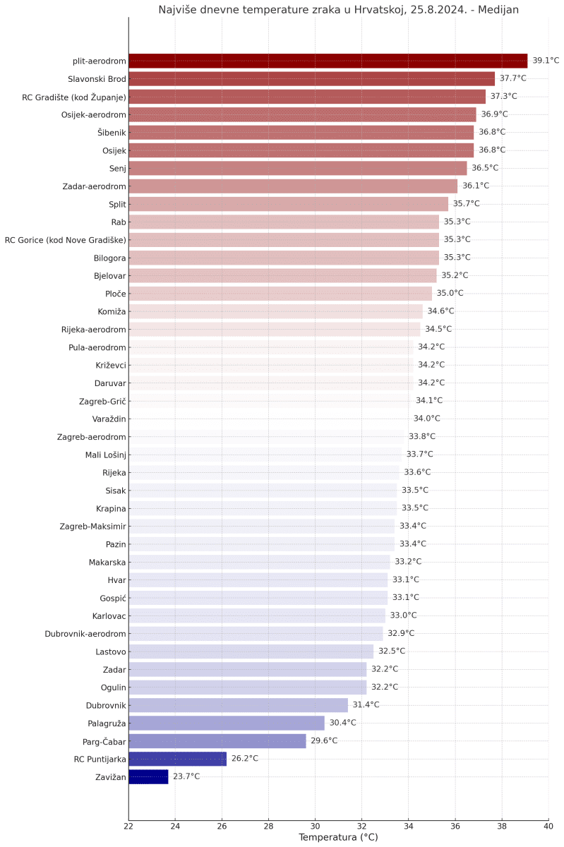 Prema službenim podacima DHMZ-a, uvjerljivo najtoplije u zemlji bilo je u splitskoj zračnoj luci s najvišom dnevnom temperaturom od čak 39,1°C. Slavonski Brod je bio drugi najtopliji s 37,7°C.