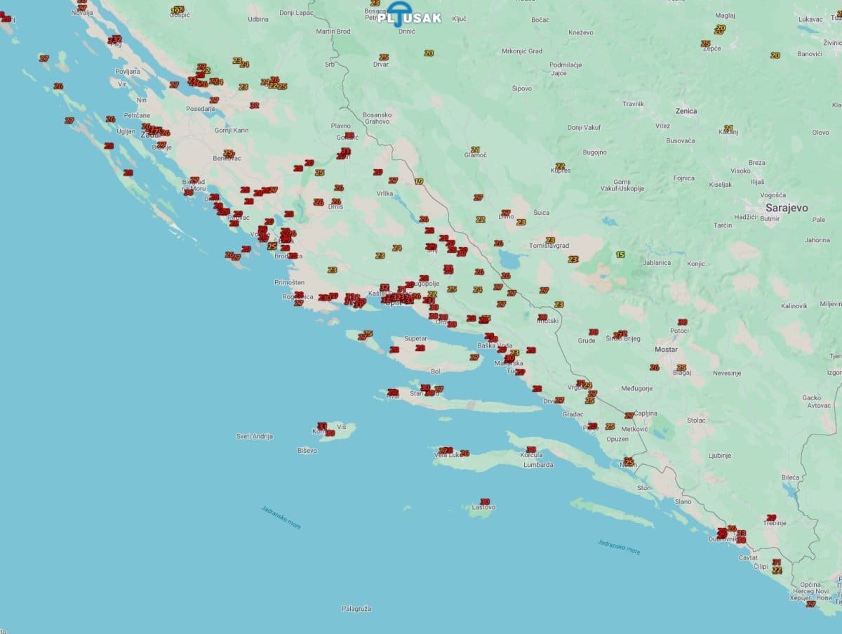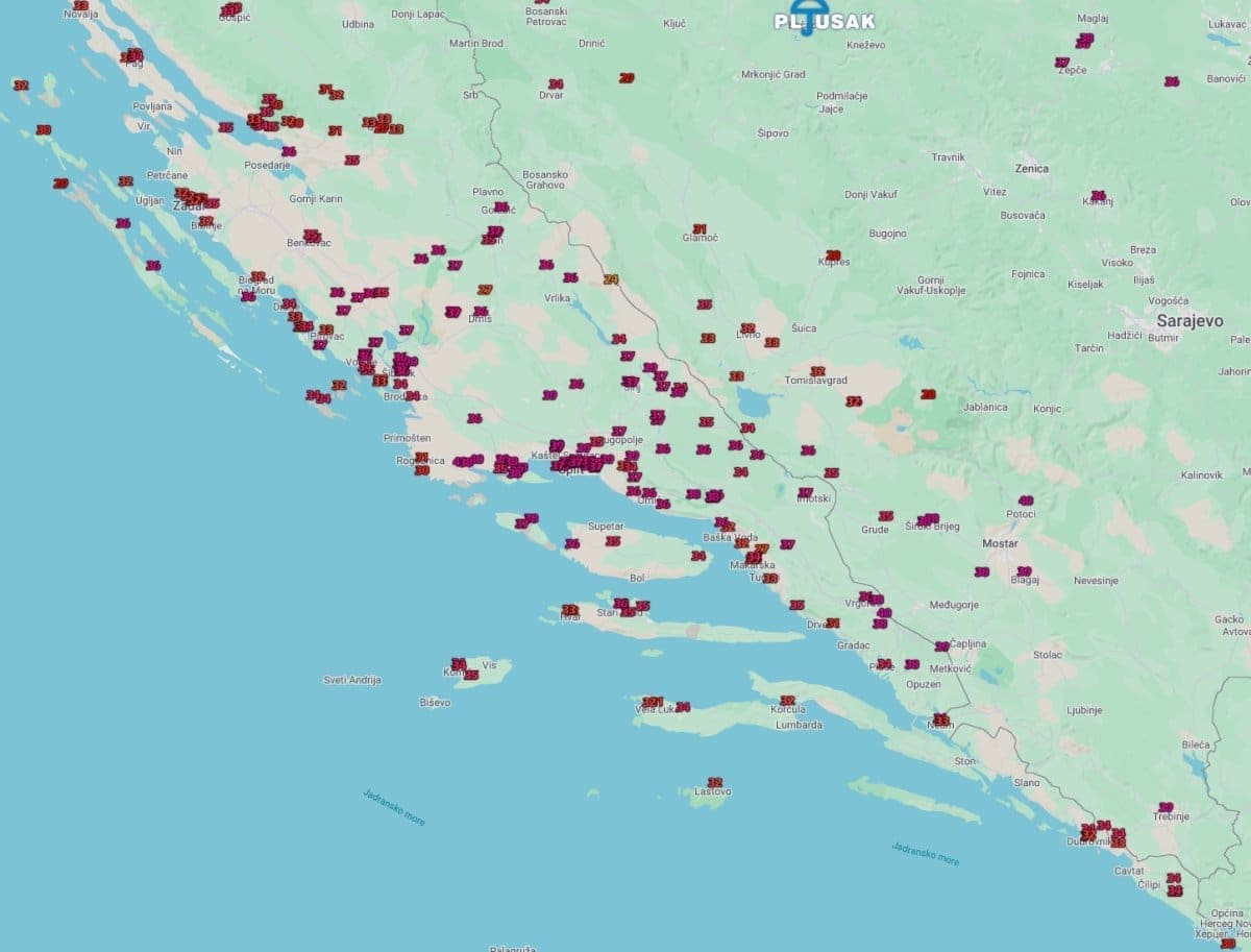 Od dalmatinskih postaja Šibenik je mjerio 37°C, zadarski aerodrom 36,1°C, a Marjan (Split) 35,3°C. Split je tako službeno zabilježio jubilarni 20. vrlo vrući dan ovog ljeta, odnosno godine, te je rekordan broj takvih dana samo dodano povećao. Očekivano, istok grada bio je topliji od marjanske šume, a Kman i Žrnovnica su prema podacima neslužbene mreže postaja Pljusak.com bili najtopliji s 39°C.