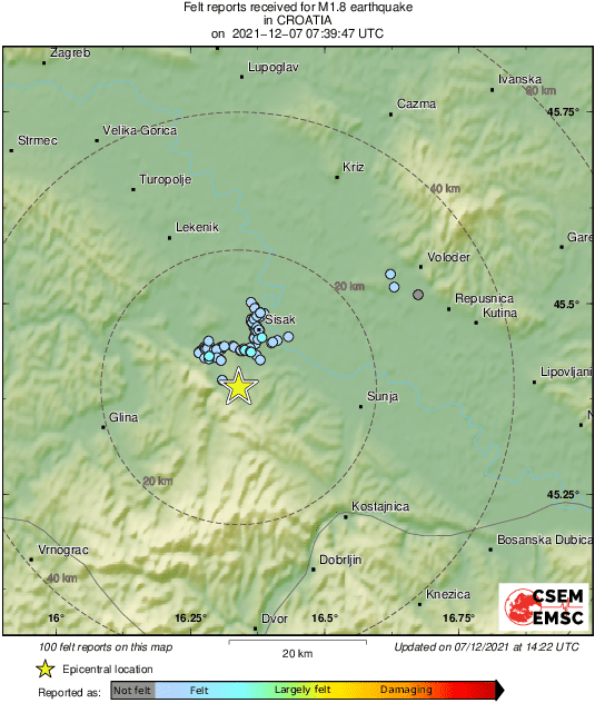 Prema podacima stranice EMSC, epicentar potresa bio je devet kilometara južno od Siska i 55 kilometra jugoistočno od Zagreba.