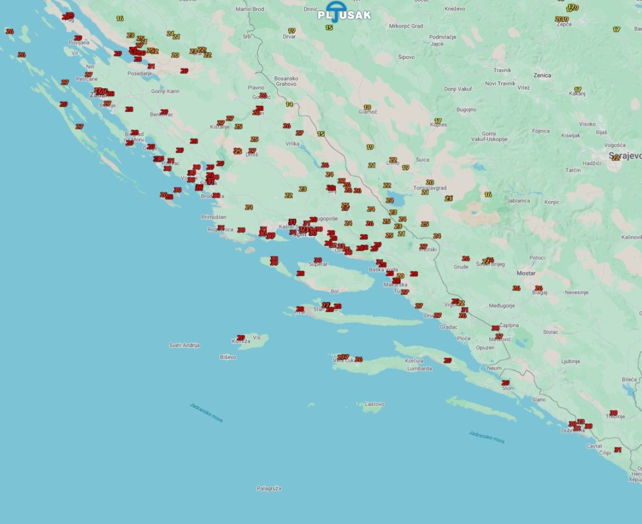 U večernjim satima dijelovi Dalmacije bilježe teško vrijeme s temperaturama iznad vrućih 30 stupnjeva Celzijusovih. Komolac u 22:30 mjeri 32.6°C, a slijede Omiš 32,2°C, Split - Split 3 32,1°C, Dugi Rat i Komiža 31,0°C, Dubrovnik 31,8°C, Split Marjan 30,6°C, Pirovac 31,1°C itd.