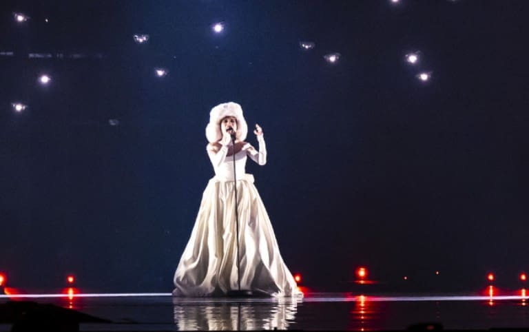 Na pozornici se pojavio u upečatljivoj bijeloj haljini nalik vjenčanici i bijeloj šubari, a publika ga je nagradila snažnim pljeskom.