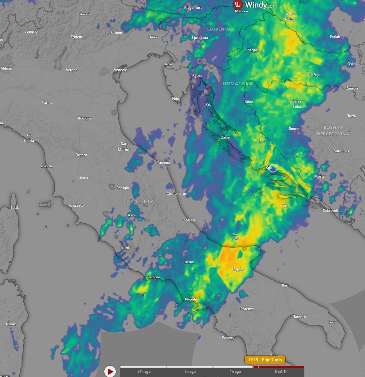 Prema aktualnoj radarskoj snimci oborina, hladna fronta se u vrijeme pisanja teksta nalazila na relaciji trogirsko zaleđe - Čiovo. Primjerice, postaja Nisko u Zagori primila je čak 24 litre kiše po metru kvadratnom u samo sat vremena, a Čiovo 21 litru. Fronta se primiče kaštelanskom i splitskom području gdje već pada kiša, pa bi su jačanjem oborina izgledne i mjestimice bujice zbog veće količine oborina u kratko vrijeme.