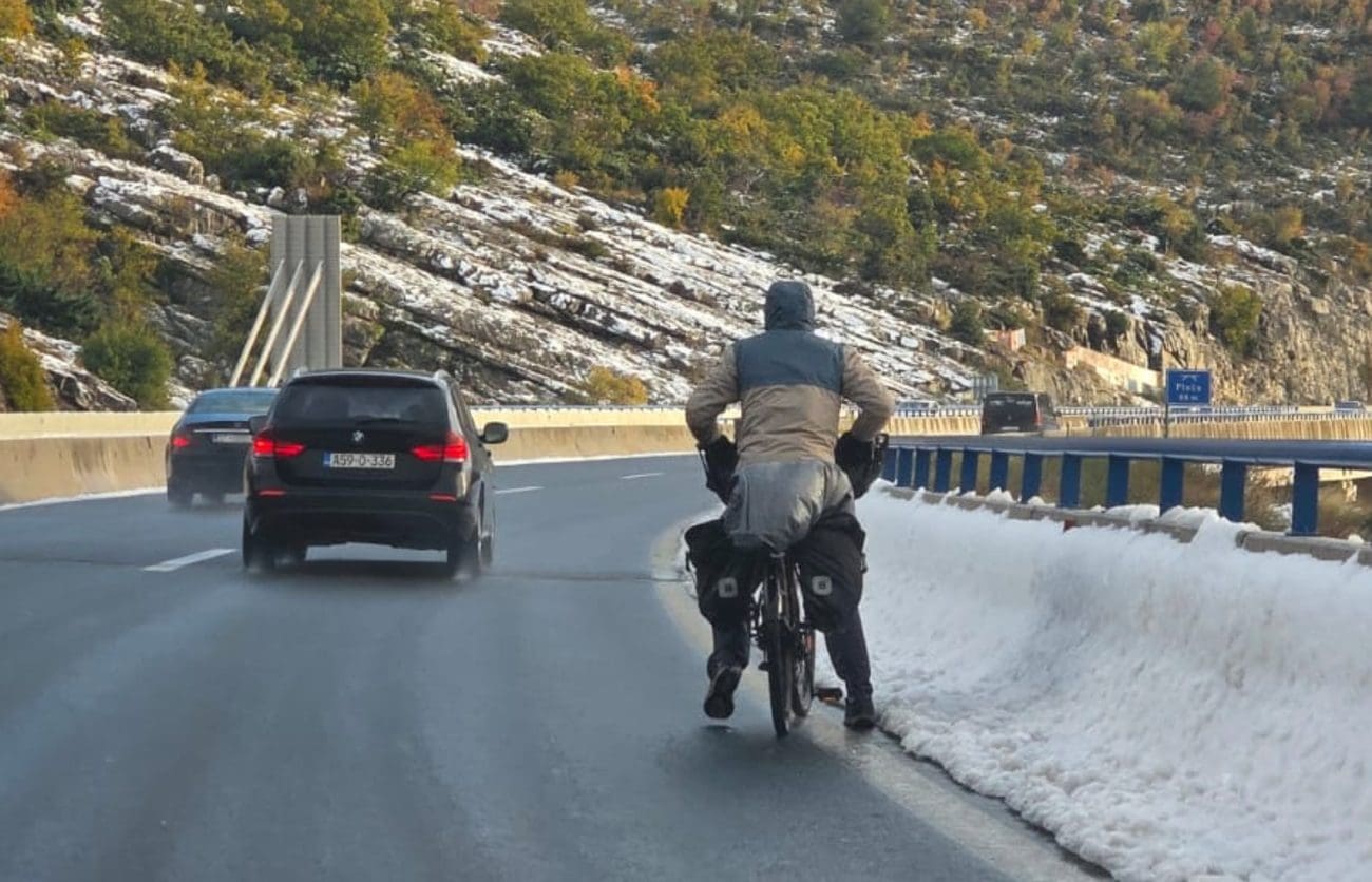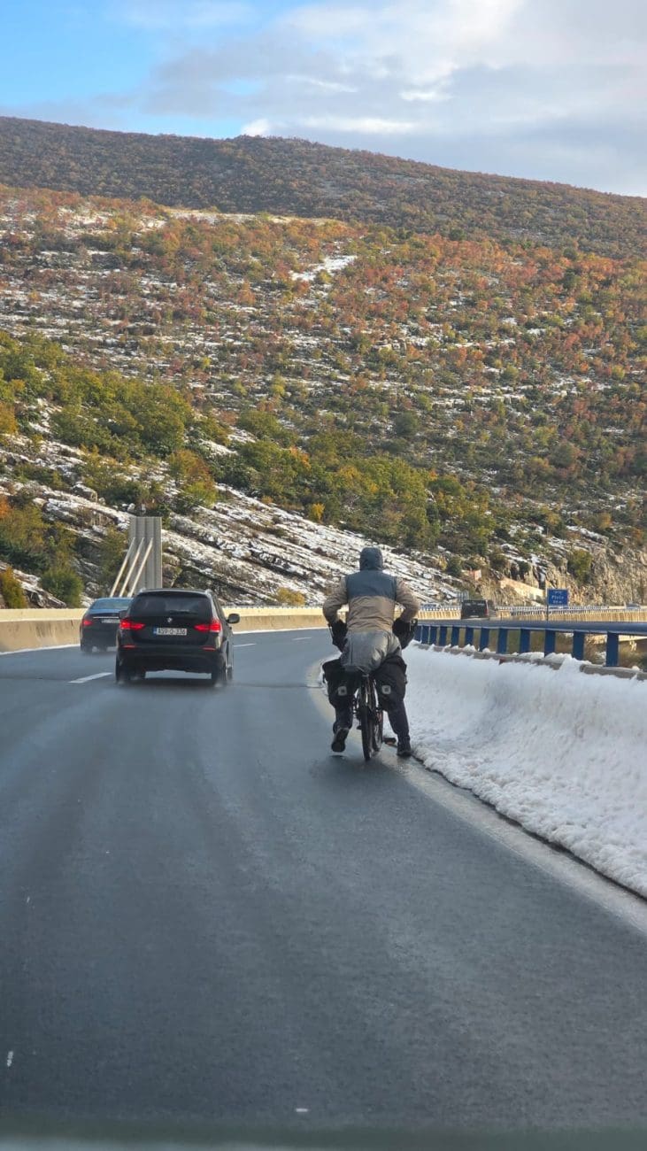 Posebnu pozornost privukao je biciklist koji se, unatoč zimskim uvjetima, kreće desnim rubom brze ceste uz snježni zid. Deblja jakna s kapuljačom i oprema na biciklu upućuju na hladnoću i otežane uvjete vožnje, a prizor dodatno naglašava kontrast između jesenskih boja u zaleđu i naglog zimskog prodora.