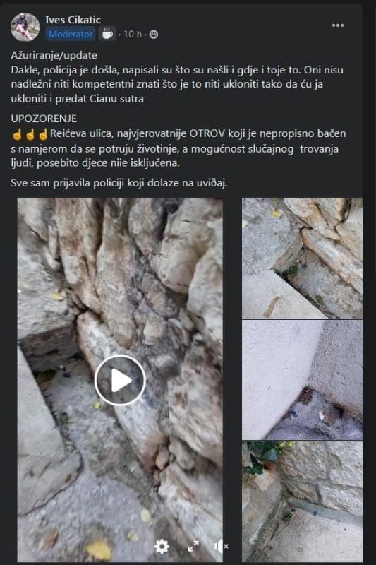 "UPOZORENJE ☝️☝️☝️Reićeva ulica, najvjerovatnije OTROV koji je nepropisno bačen s namjerom da se potruju životinje, a mogućnost slučajnog trovanja ljudi, posebito djece nije isključena. Sve sam prijavila policiji koji dolaze na uviđaj. UPDATE Dakle, policija je došla, napisali su što su našli i gdje i to je to. Oni nisu nadležni niti kompetentni znati što je to niti ukloniti tako da ću ja ukloniti i predat Cianu sutra", objavila je Cikatić u facebook grupi Varoš.