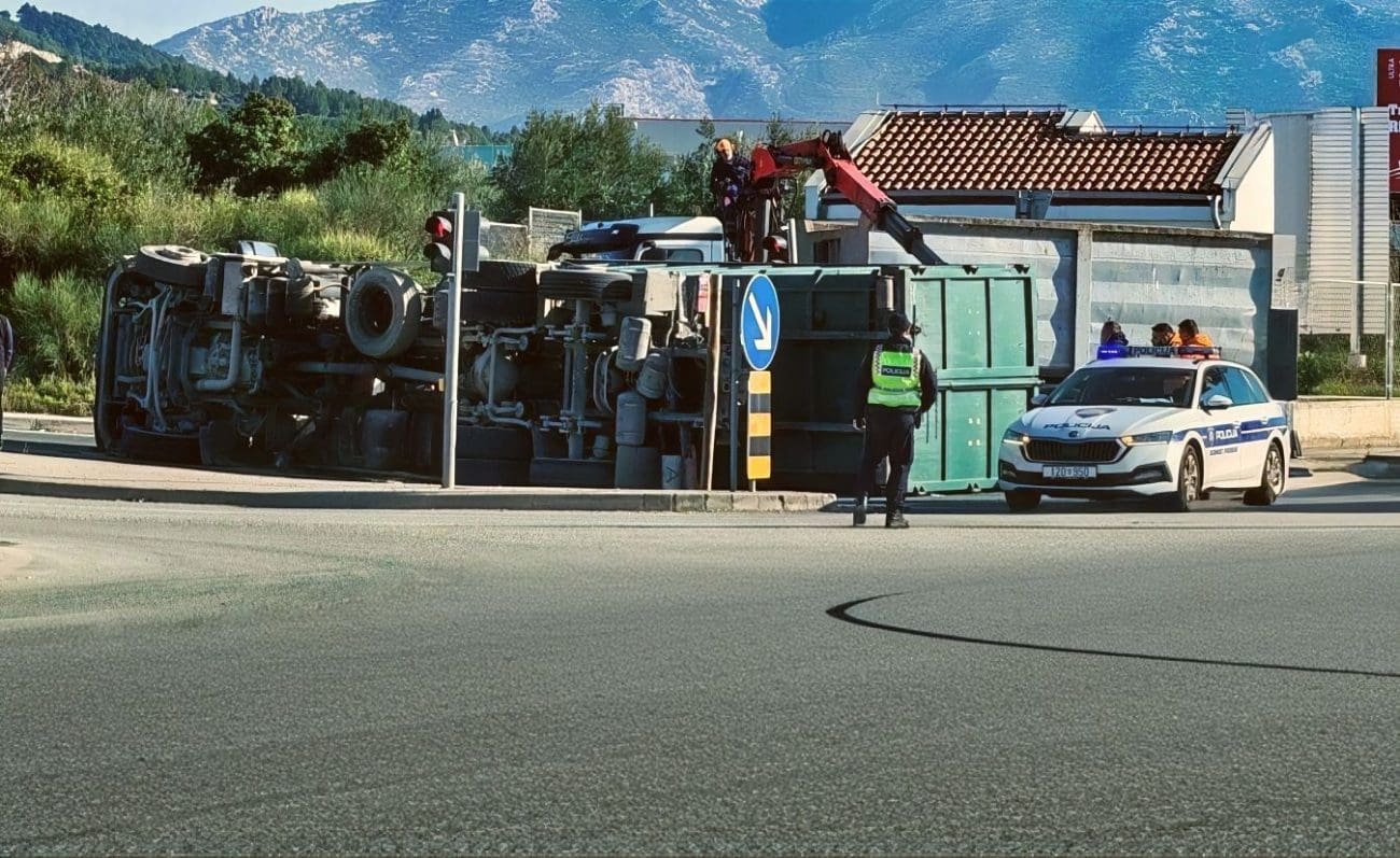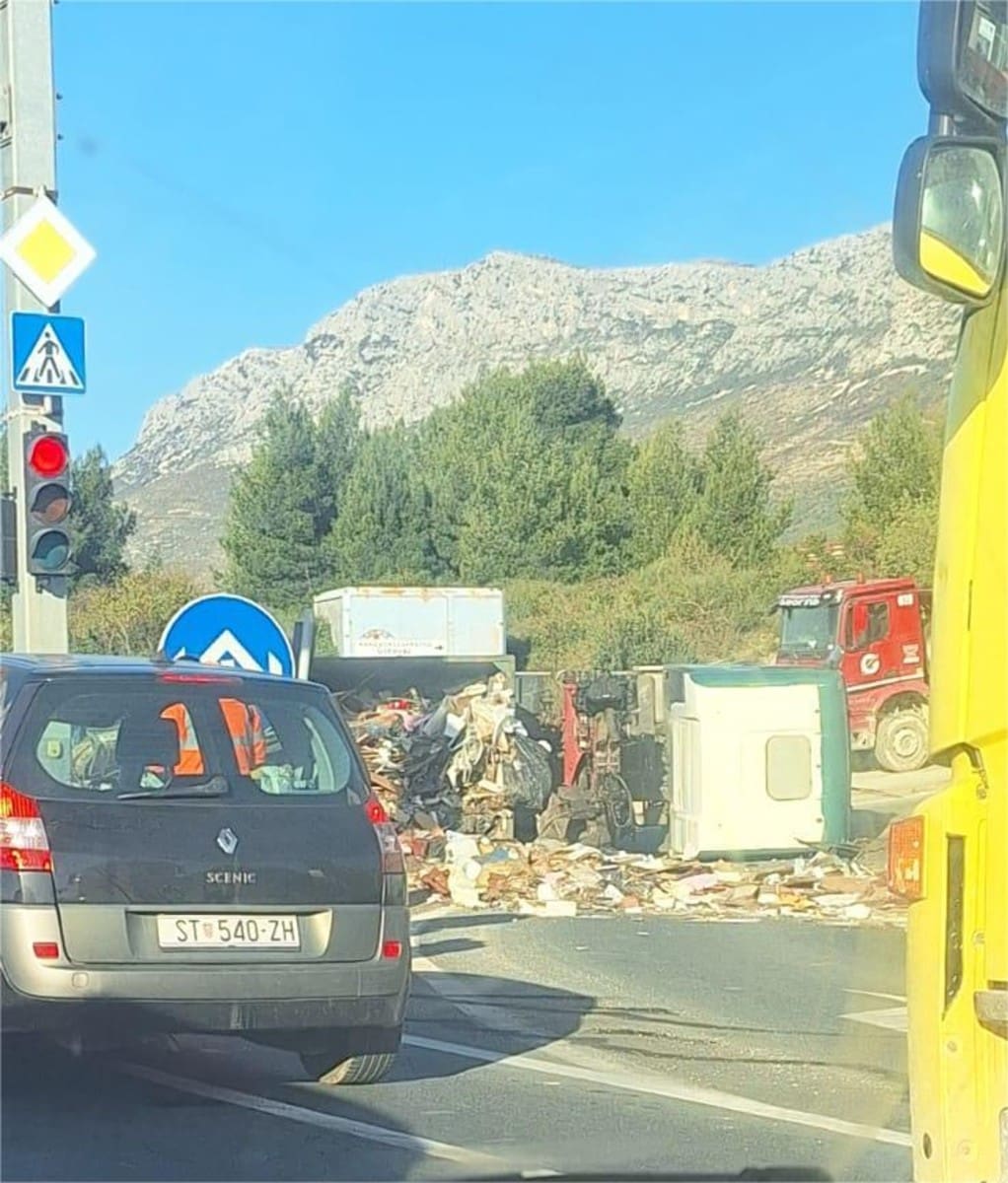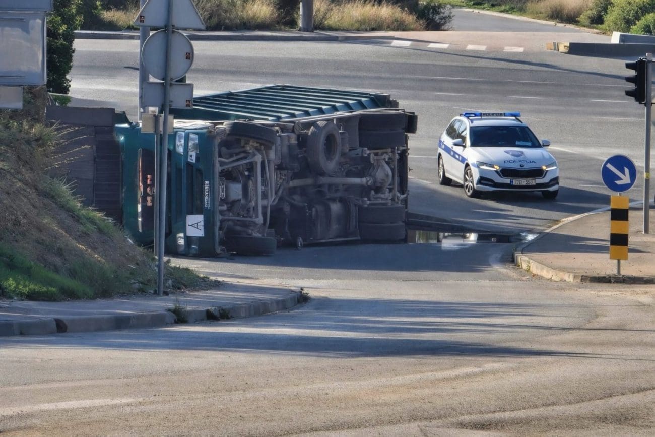 Danas ujutro, oko 9:00 sati, policija je zaprimila dojavu o prevrtanju kamiona na državnoj cesti D8 u Kaštelima kod trgovačkog lanca Metro.