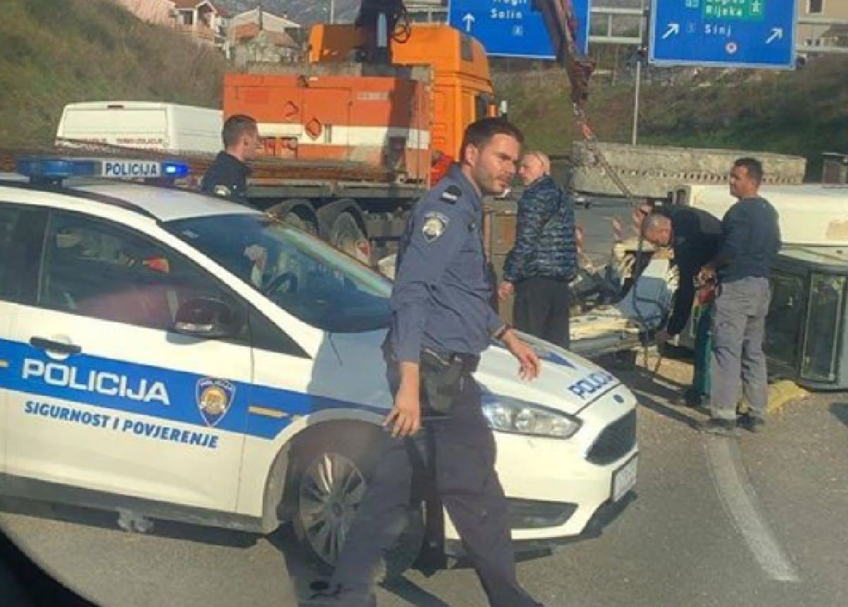 Na Facebook stranici Policija zaustavlja - Split objavljene su fotografije bagera koji je na rotoru u Solinu ispao iz kamiona.