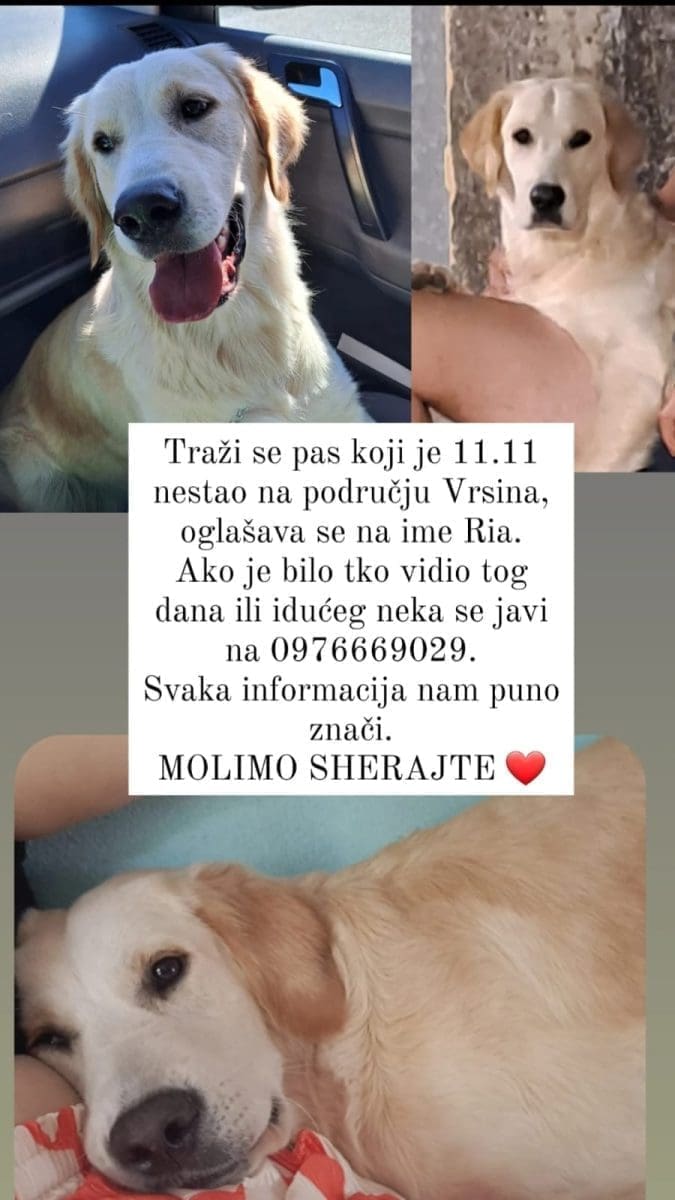 Podijeli Facebook Twitter Telegram WhatsApp E-mail adresa U subotu 11. studenog nestao je pas na području Vrsina. Ova labradorica odaziva se na ime Ria.Tekst se nastavlja nakon oglasa Ako ju je itko vidio od toga dana ili ima bilo kakve informacije o psu neka se javi na broj 0976669029. Moja reakcija na članak je... Ljubav 0 Haha 0 Nice 0 What? 0 Laž 0 Sad 1 Mad 0 Facebook Twitter Whatsapp Telegram