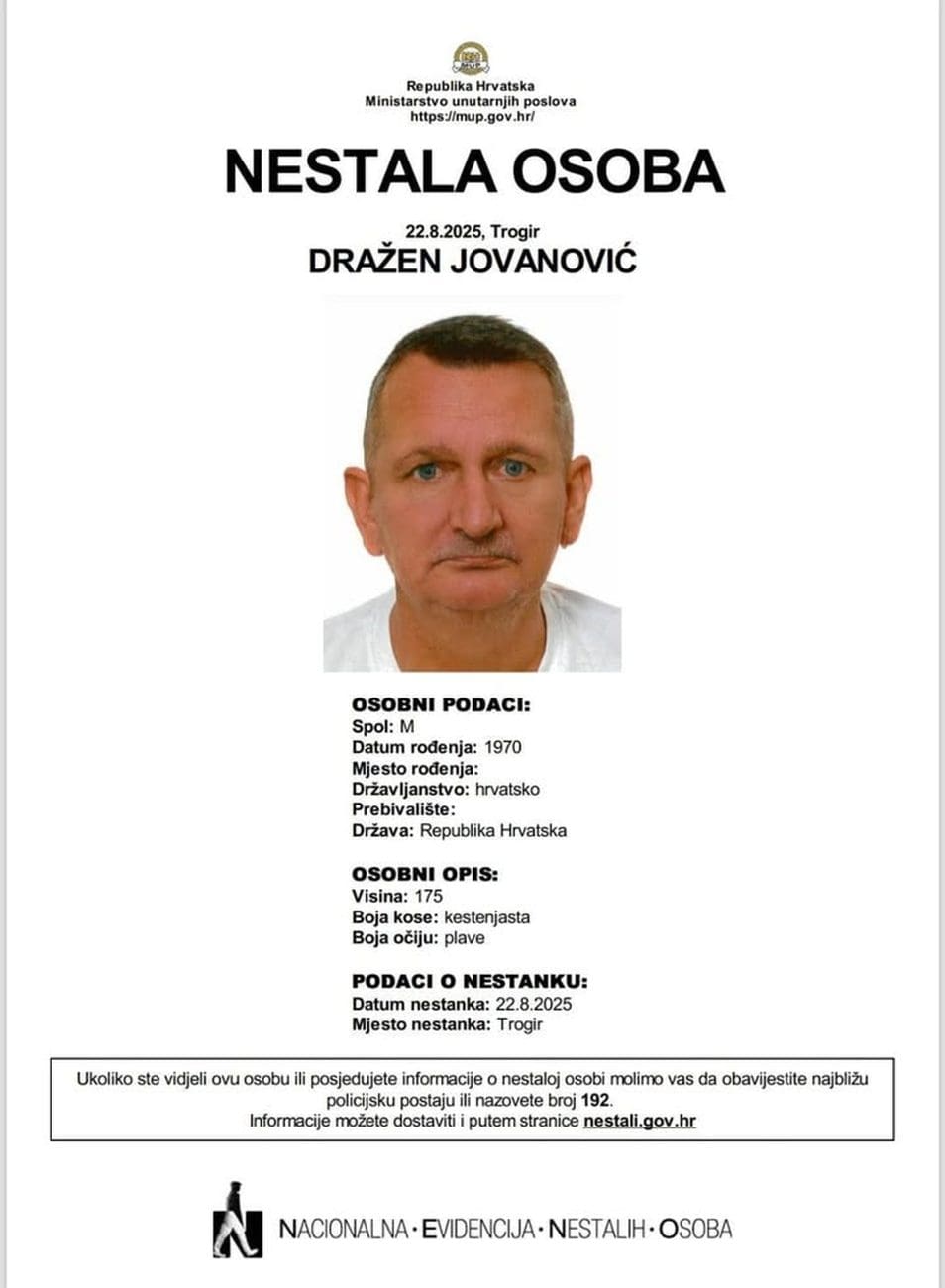 U Trogiru je prijavljen nestanak Dražena Jovanovića, hrvatskog državljanina rođenog 1970. godine. Prema informacijama iz Ministarstva unutarnjih poslova Republike Hrvatske, Dražen Jovanović posljednji put je viđen u svom mjestu prebivališta, u Trogiru.