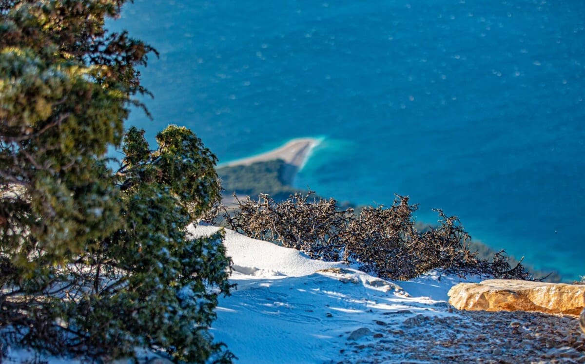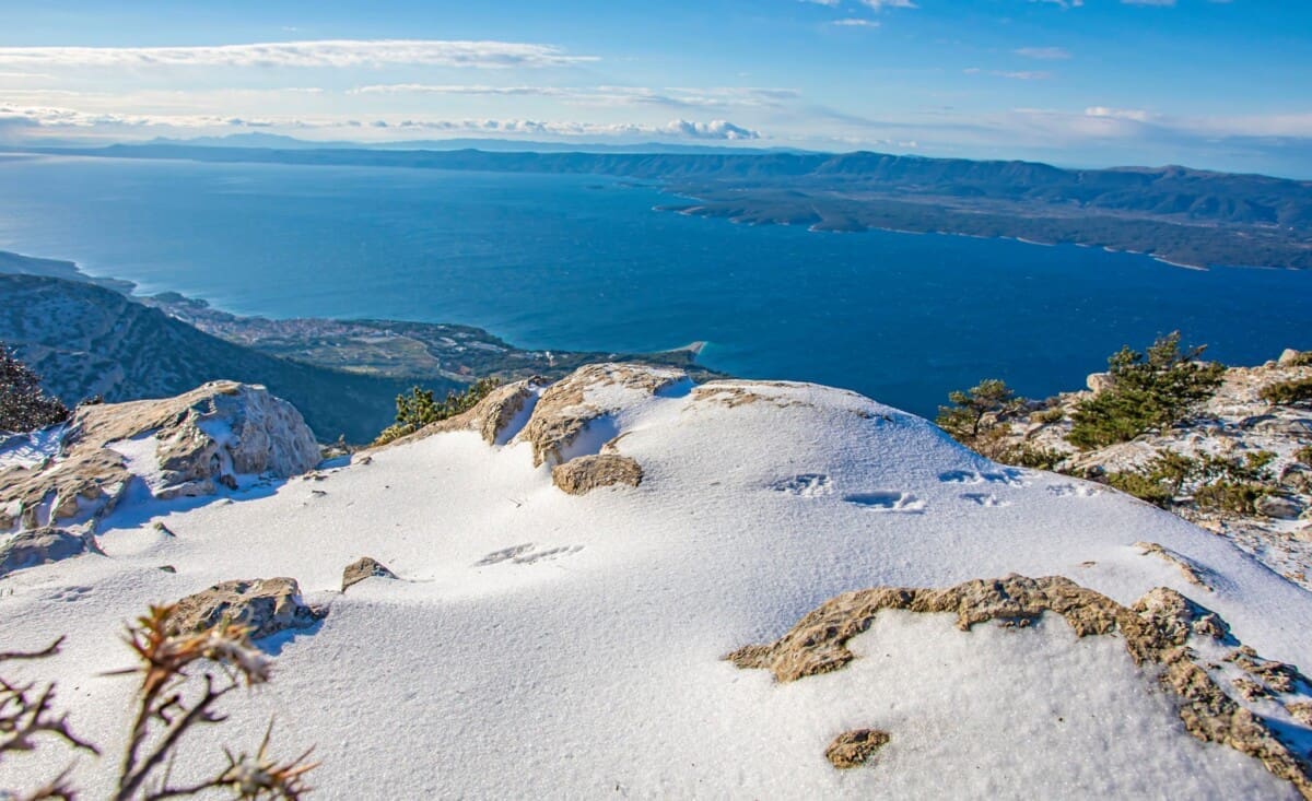 Očekivano, najviše snijega na Braču palo je na Vidovoj gori. Nekoliko centimetara snijega bilo je dovoljno da jutarnji posjetitelji iskuse iznimno rijedak događaj - snježni pokrivač u travnju.
