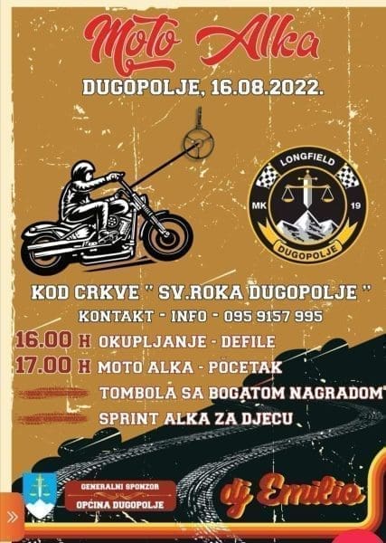 Povodom blagdana sv. Roka u Dugopolju kraj mjesne crkve u utorak (16. kolovoza) će se održati Moto alka. Organizatori najavljuju da je okupljanje predviđeno u 16 sati, a u 17 je početak manifestacije.