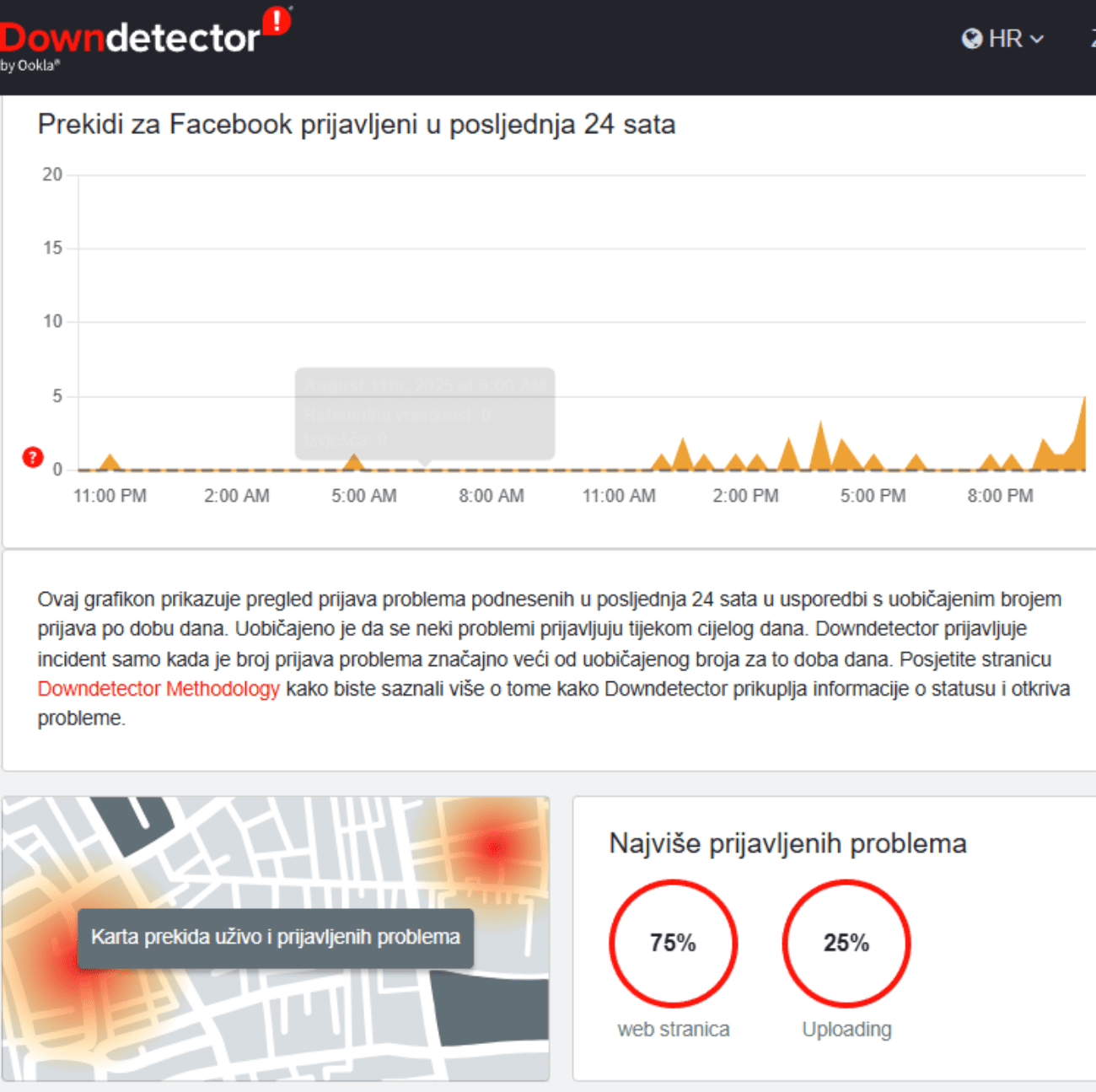 Korisnici Facebooka diljem svijeta, uključujući i Hrvatsku, danas su prijavili probleme s korištenjem ove društvene mreže. Prema dojavi korisnika, najčešći su problemi povezani s pristupom web stranici i učitavanjem sadržaja, a dio korisnika ne može uopće uploadati fotografije ili videozapise.