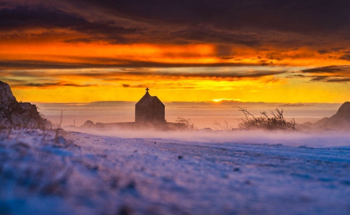 Toman je snimio prekrasan prizor snježne vijavice i ove kapelice točno u smiraj dana, kada je nebo bilo obojeno u intenzivno predvečernje rumenilo...