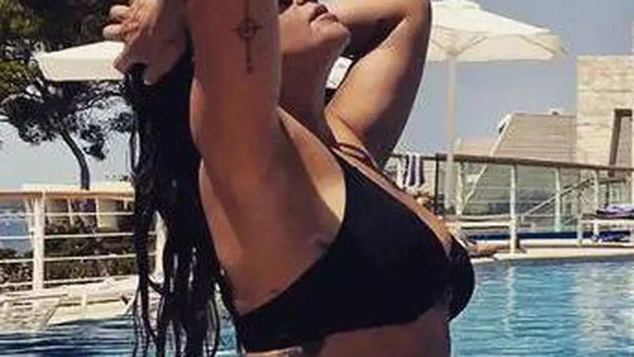 Pozirala je sjedeći na rubu bazena. U crnom bikiniju sa rukama iznad glave i pogledom usmjerenom prema suncu istaknula je sve svoje atribute.