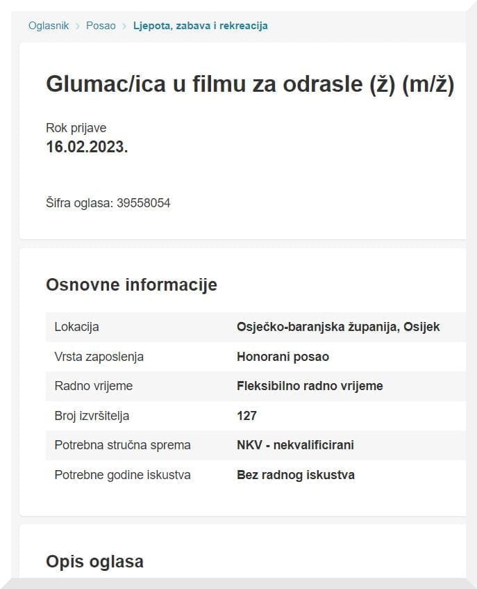 Ovih je dana na internetskim oglasnicima u Hrvatskoj osvanuo neobičan oglas za posao: traži se najmanje desetero glumica i glumaca u filmu za odrasle.