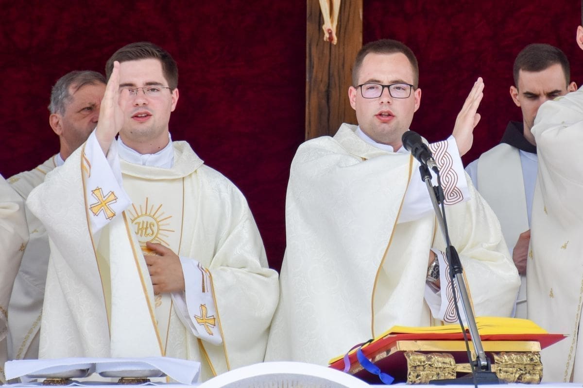 Sveto misno slavlje započelo je u 10.30 procesijom od škole do igrališta, na kojem je bio postavljen vanjski oltar i sve potrebno za dostojnu proslavu, uz pjesmu Kraljici svete Krunice. Uz fra Marka i don Renata u misnom slavlju sudjelovao je kao đakon njihov treći brat don Robert Pudar, đakon kotorske biskupije Damir Vrbešić, a u koncelebraciji su bili fra Marko Mrše, provincijal Franjevačke provincije Presvetog Otkupitelja, dekan Katoličko-bogoslovnog fakulteta Sveučilišta u Splitu, fra Šimun Bilokapić, župnik fra Božo Gulić te još četrdeset braće svećenika, među kojima su bili kum mladomisnika fra Marka, fra Nikica Ajdučić, župnik Župe svetog Luke u Otoku Dalmatinskom, te o. Ante Jakus, OCD, propovjednik na Mladoj misi, piše bitno.net.