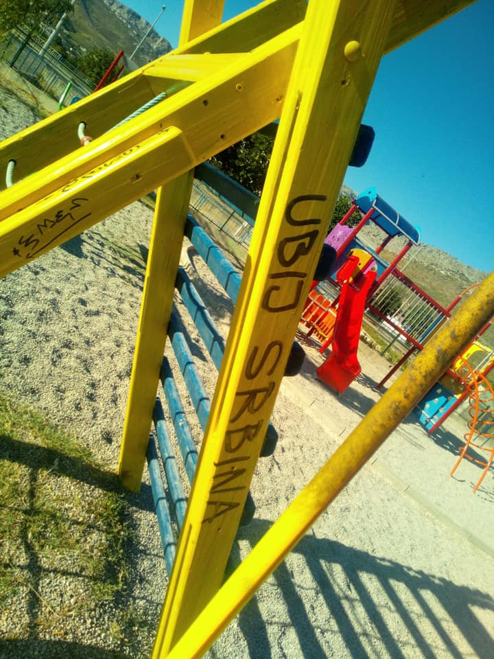 Nekome je zasmetala činjenica da djeca imaju lijepo uređeno igralište pa ga je gotovo u cijelosti išarao raznim porukama, uključujući one kojima se poziva na ubijanje i nacionalnu mržnju. Tako je na dječjim spravama ispisano "Ubij Srbina"; a počinitelj nije zaboravio ni "počastiti" policiju....