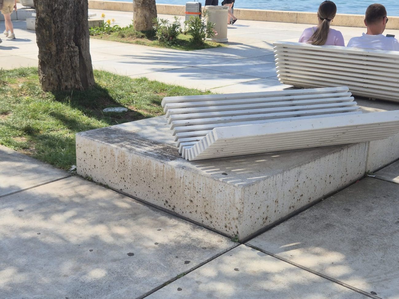 Što se točno dogodilo, nije poznato, ali jedna od bijelih klupa u centru grada više nikome ne može nudili sjedalo za odmoriti se uz pogled na more. Nije ni sklonjena, što je čudno, pa se pokoje dijete s njom i 'poigra'.