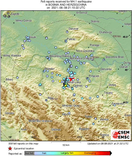 M4.1 #earthquake (#zemljotres) strikes 14 km NE of Banja Luka (Bosnia & Herzegovina) 15 min ago. Updated map of its effects: pic.twitter.com/OMY7BKgLDG