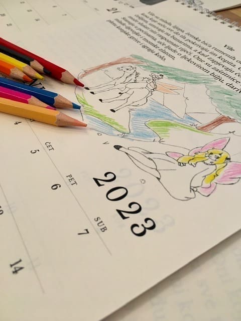 - Ove smo godine sudjelovale na 4. međunarodnom Milenijskom natjecanju u Osijeku, gdje smo sa svojom poslovnom idejom osvojile 3. mjesto u konkurenciji od 80 srednjih škola. Naša poslovna ideja Story TO GO odgovara na pitanje kako širiti mitologiju u novom mileniju? Moj tim „Odmetnuti anđeli“ sakupio je priče iz usmene predaje o narodnim vjerovanjima poljičkog, sinjskog i imotskog kraja. Nadnaravna bića ili odmetnute anđele zatim su ilustrirali, a kratke priče su preveli na engleski jezik. Nakon toga su izradile slikovnicu s pričama o vilama, ovasarima, vukojarcima i ostalim „plašelinama“, ali u obliku kalendara u kojem se crteži mogu obojati prema želji. Crteže su također otisnule i na bookmarkere i razglednice na kojima se nalazi QR kod s audio pričom. Na ovaj način priču o poljičkim vilama i imotskim vukojarcima možete poslati na drugi kraj svijeta ili je jednostavno ponijeti sa sobom - pohvalila nam se Elvira.