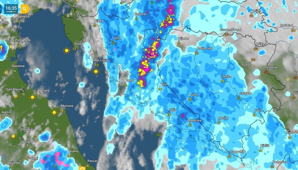 Iza 16 sati grmljavinsko nevrijeme je zahvatilo prvo područje Maslenice, a onda se nastavilo kretati prema sjevernom području zadarskog zaleđa. Bilo je izraženijih grmljavinskih pljuskova, ali i prolazne tuče. Grmljavinska linija dugačka je oko 250 kilometara i proteže se od Koprivnice do Ravnih kotara.