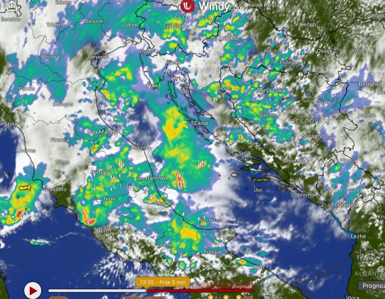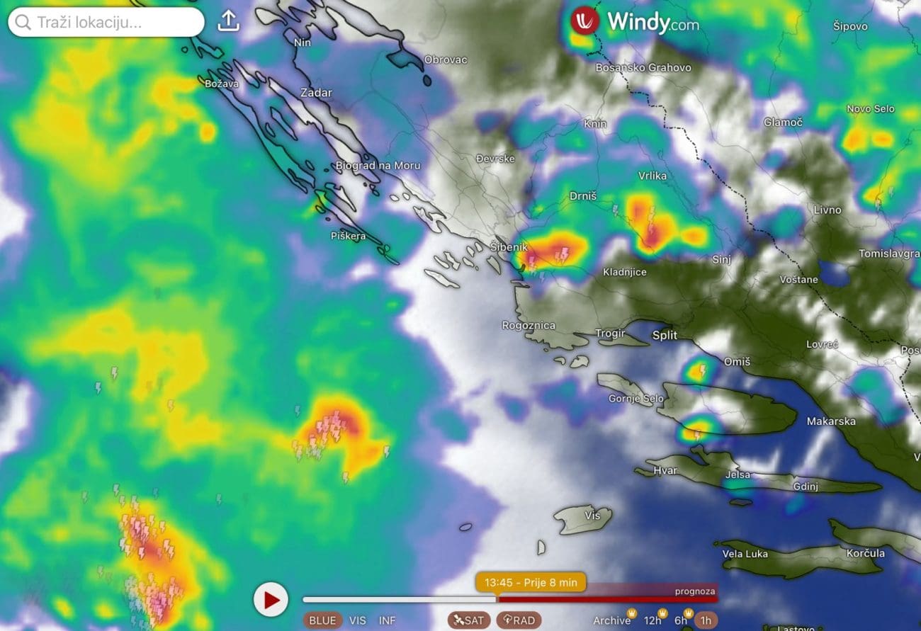U ranim poslijepodnevnim satima kišni oblaci zahvatili su dio sjevernog Jadrana i unutrašnjosti, a grmljavinski oblaci počeli su se stvarati na moru srednjeg Jadrana. Osim na otvorenom moru, grmljavinski oblak se razvio u šibenskom zaleđu i proteže se prema Svilaji. Sjeverni Jadran i sjeverna Dalmacija bilježe znatno niže temperature od područja južnije od Šibenika. Primjerice, u 14 sati Zadar mjeri 21°C, dok je u srednjoj Dalmaciji do vrućih 30°C.