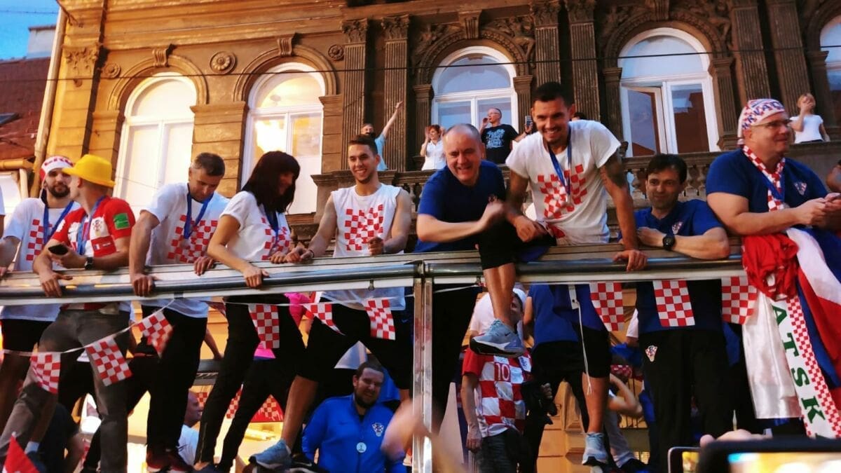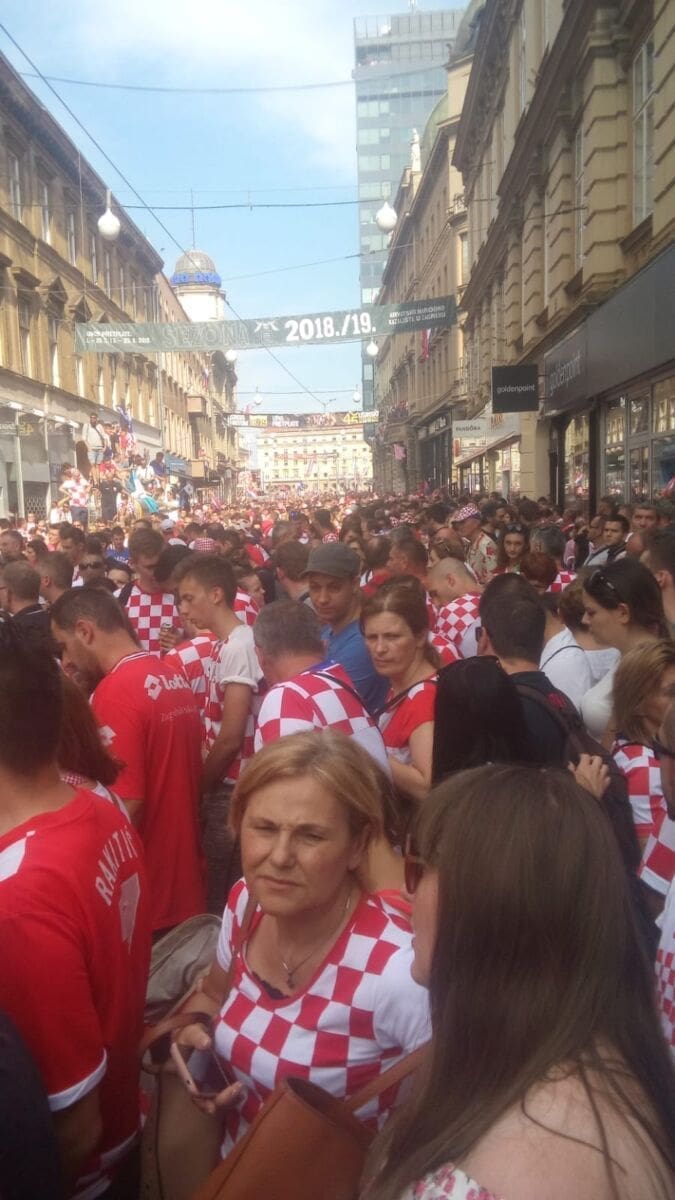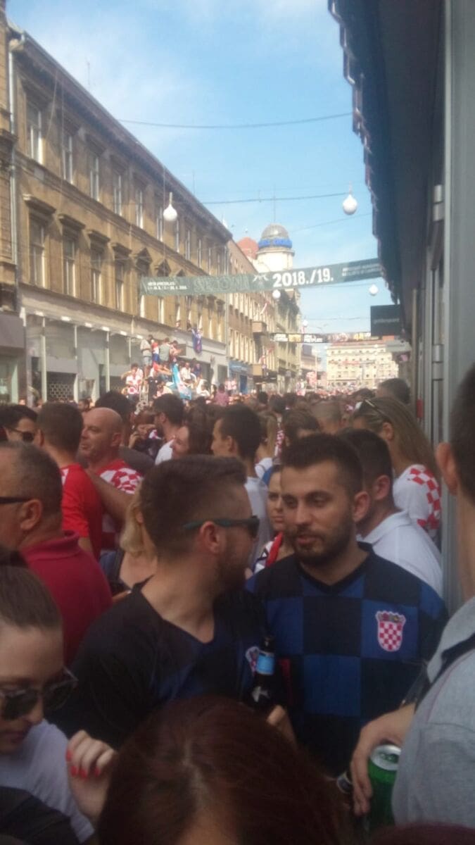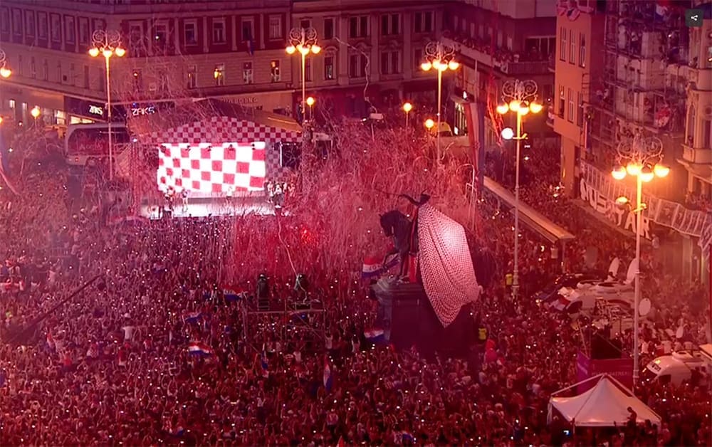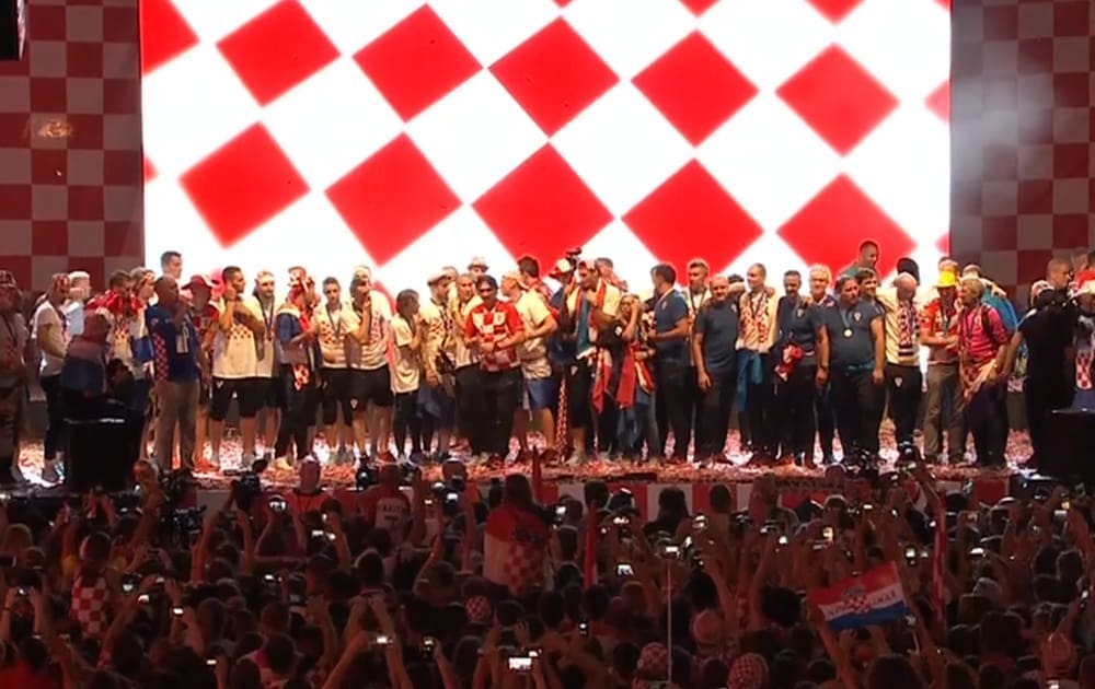 20:45 Nakon višesatne vožnje autobusom iz zračne luke do centra Zagreba, igrači su napokon stigli na Trg bana Jelačića. Zavladao je kaos, stotinu tisuća navijača uzvikuje njihova imena i "Mi Hrvati", na pozornici Zaprešić boysi pjevaju "Igraj moja Hrvatska".