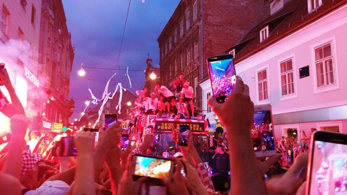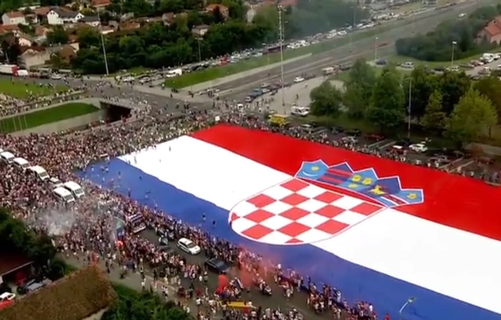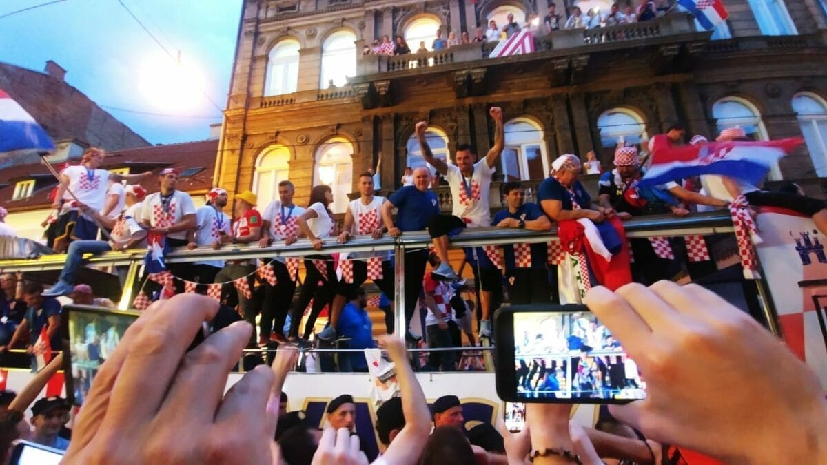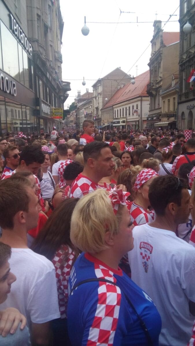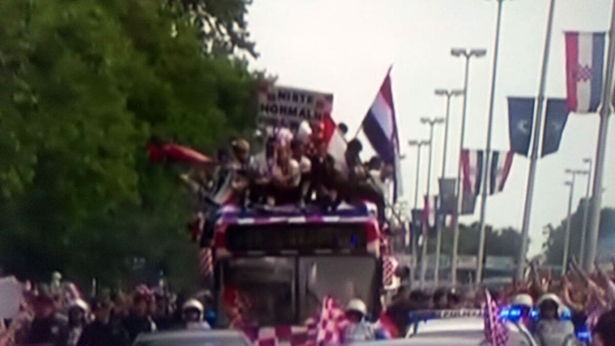 20:45 Nakon višesatne vožnje autobusom iz zračne luke do centra Zagreba, igrači su napokon stigli na Trg bana Jelačića. Zavladao je kaos, stotinu tisuća navijača uzvikuje njihova imena i "Mi Hrvati", na pozornici Zaprešić boysi pjevaju "Igraj moja Hrvatska".