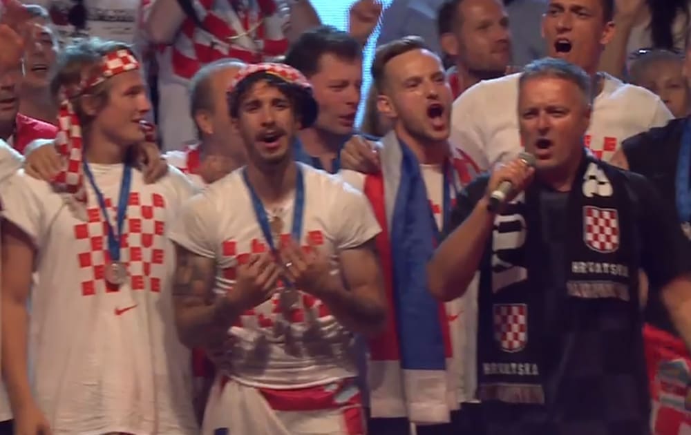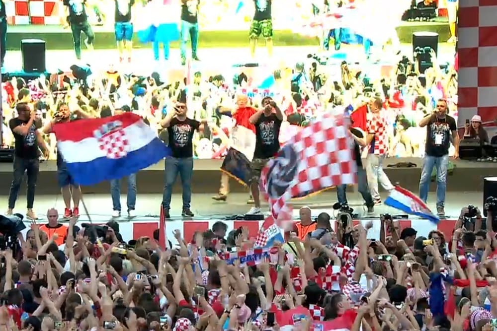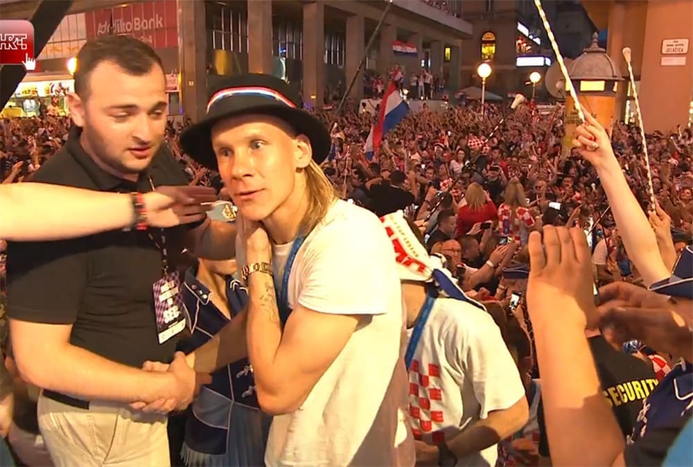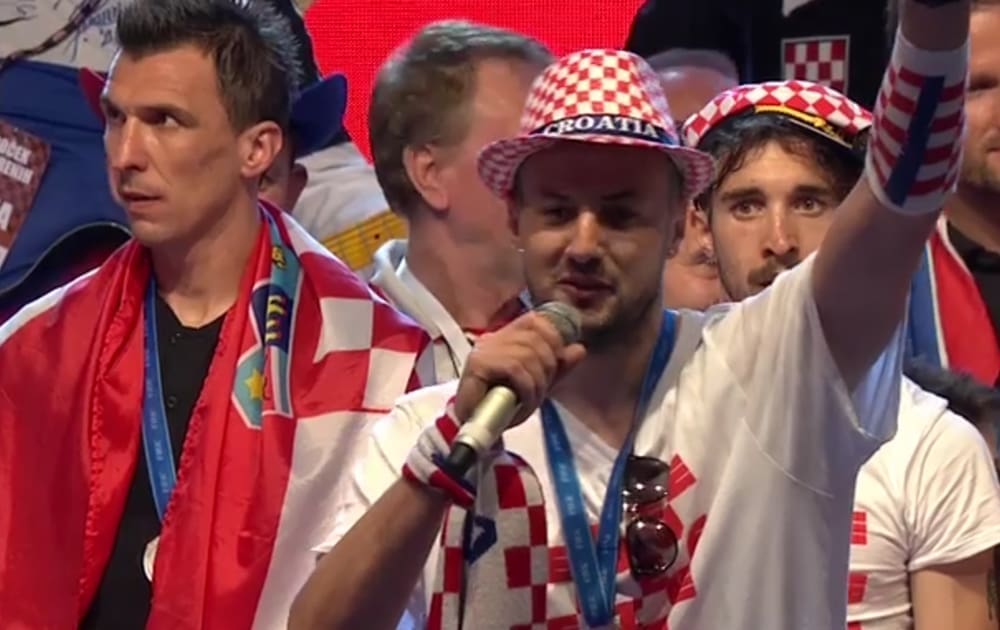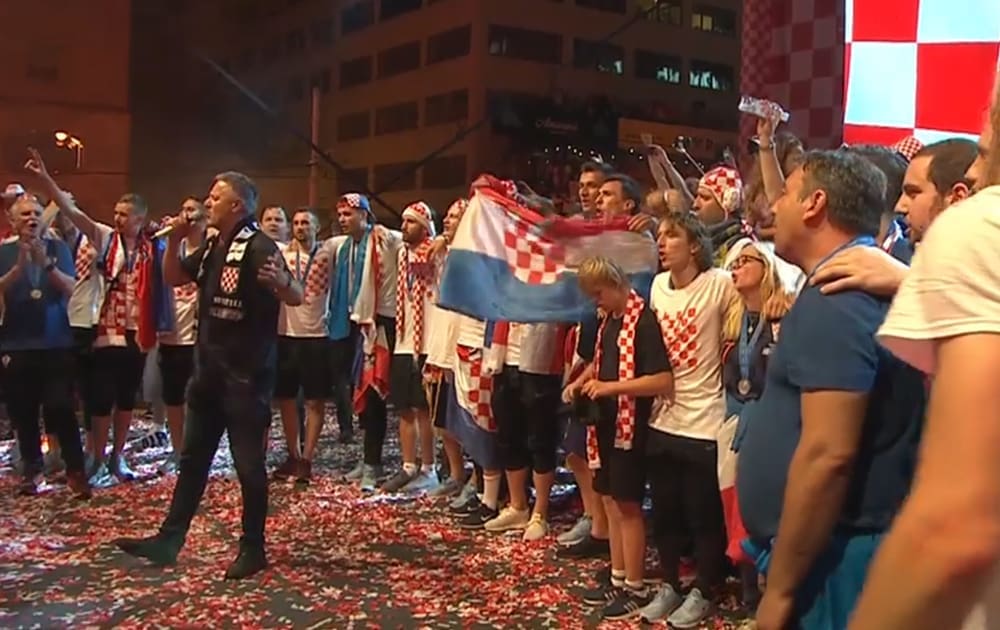 21:00 Navijači su Vatrenima priredili zaista vatren doček na glavnom zagrebačkom trgu. Na pozornici ih je dočekao Mirko Fodor koji je nakon najave svakog navijača poveo pjevanje hrvatske himne "Lijepa naša". Na pozornicu je stigao i Mladen Grdović koji je s njima zapjevao "Nije u šoldima sve"