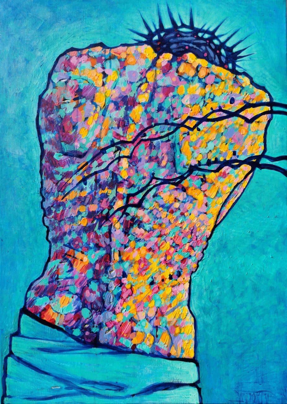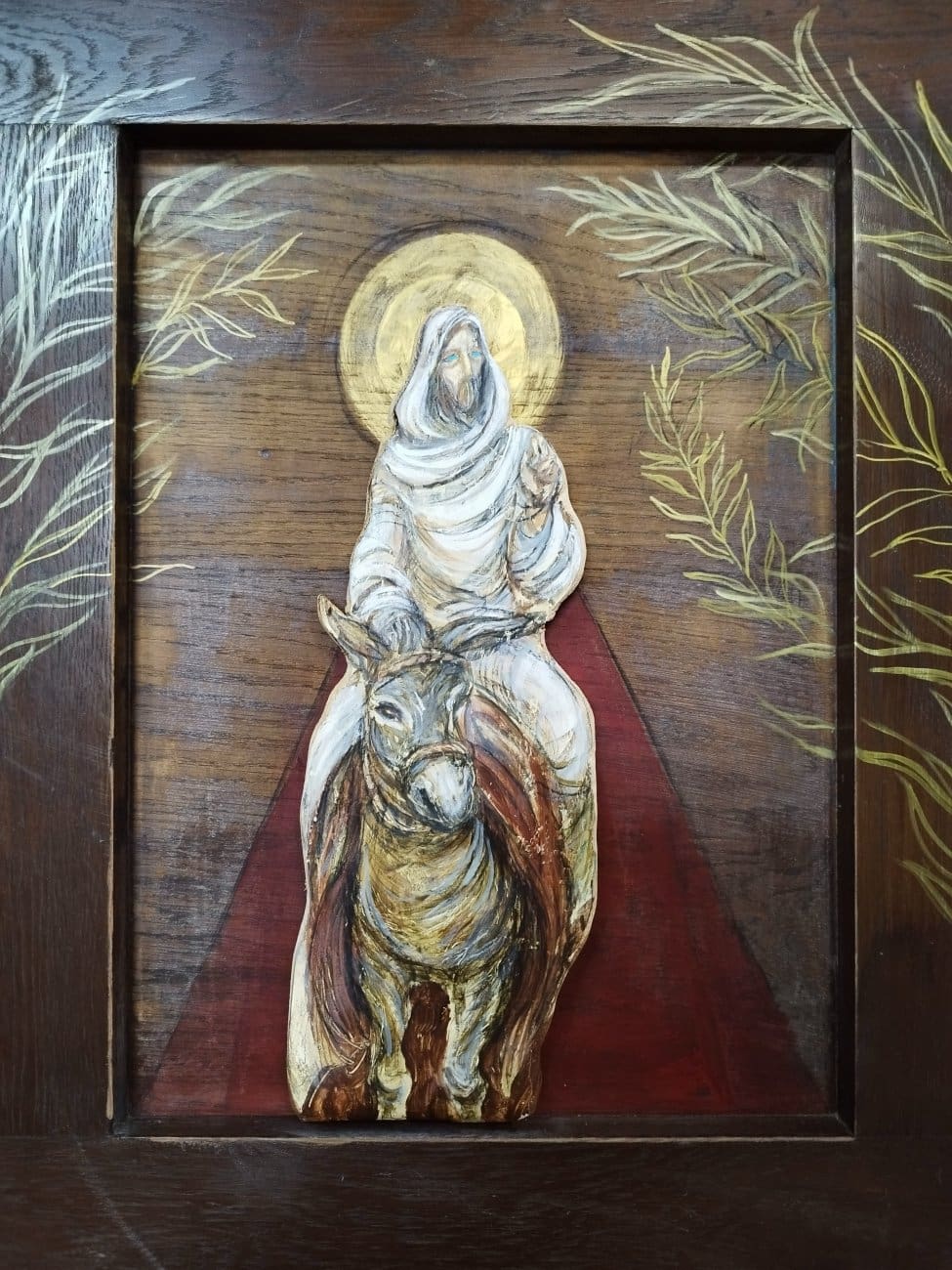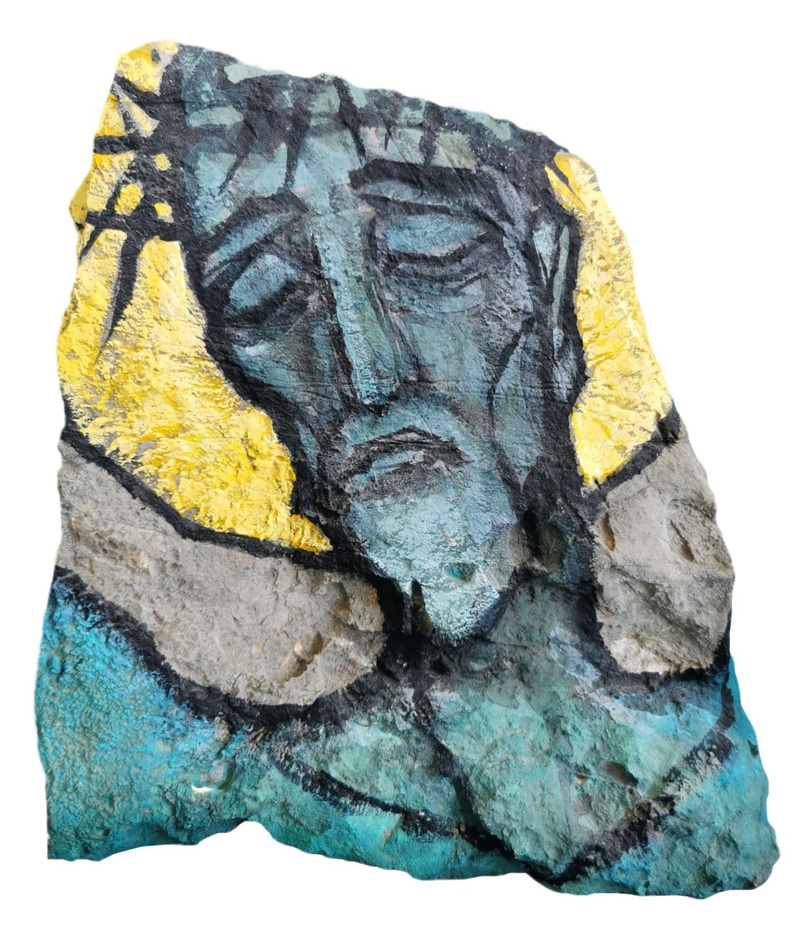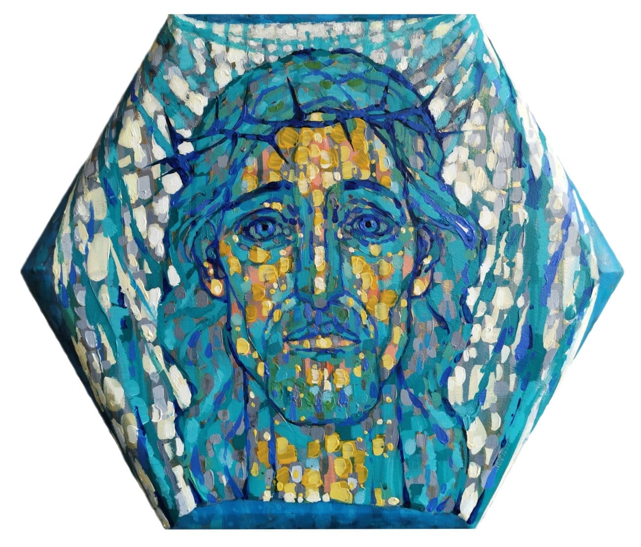 Triptih Krista počinje poniženjem s trnovom krunom, u sredini je patnja na križu, završava uskrsnućem i izbavljenjem od muke sebe i nas koji tome težimo. Muka je prikazana u potpunom odsustvu crnila - na ljubičastoj podlozi s puno dodanih drugih boja. Nježnim i gustim potezićima kista lice i gornji dio prsiju titraju na sve moguće načine životne težine, trpljenja, patnje i nevolje. I baš kako je muka usamljena u svakom pojedincu, tako je i na ovom zidu usamljena – nema drugih umjetnina uz nju. Definira pravac istok – zapad, svojevrsni decumanus.
