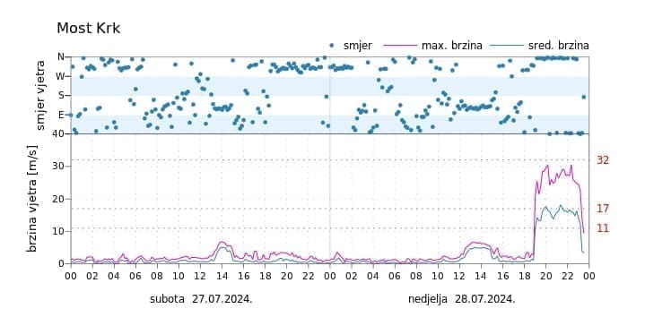 Bura je u ranu večer zapuhala na sjevernom Jadranu, a ponegdje, kao na Krčkom mostu, najjači udari bili su blizu orkanskih vrijednosti. U kasnim večernjim satima umjerena bura s pokojim jakim udarom stigla je i do srednje Dalmacije, na splitsko i makarsko područje.
