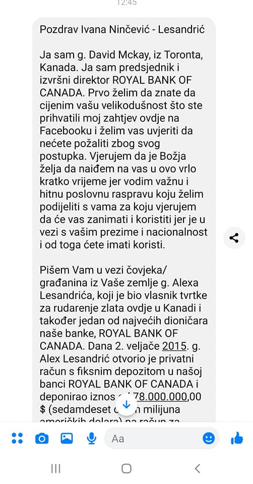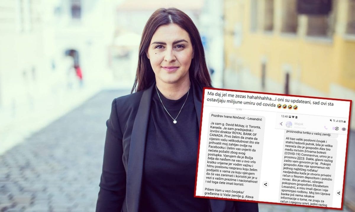 "Ma daj jel me zezas hahahhahha....i oni su updateani, sad ovi sta ostavljaju milijune umiru od covida", napisala je kratko nekadašnja saborska zastupnica Mosta, a u sadržaj svog posta objavila je i poruku koju je dobila od gospodina "Davida McKaya" iz Toronta.